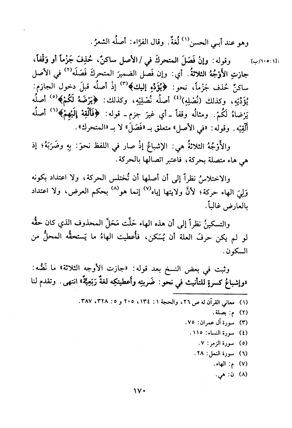 وقوله: وإن فصل المتحرك في / الأصل ساكن حذف جزماً أو وقفاً جازت الأوجه الثلاثة. أي: وإن فصل الضمير المتحرك فصله في الأصل ساكن حذف جزماً نحو: {يُؤَدِّهِ إِلَيْكَ} إذ أصله قبل دخول الجازم: يؤديه وكذلك (نصله) أصله نصليه وكذلك: {يَرْضَهُ لَكُمْ} أصله يرضاه لكم. ومثاله وقفاً -أي غير جزم - قوله: {فَأَلْقِهْ إِلَيْهِمْ} أصله ألقيه وقوله: " في الأصل" متعلق ب "فصل" لا ب" المتحرك".