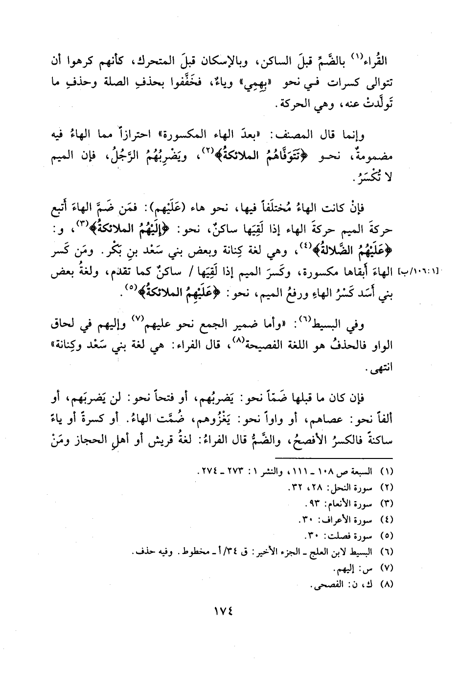 وفي البسيط: " وأما ضمير الجمع نحو عليهم وإليهم في لحاق الواو فالحذف هو اللغة الفصيحة، قال الفراء: هي لغة بني سعد وكنانة" انتهى.