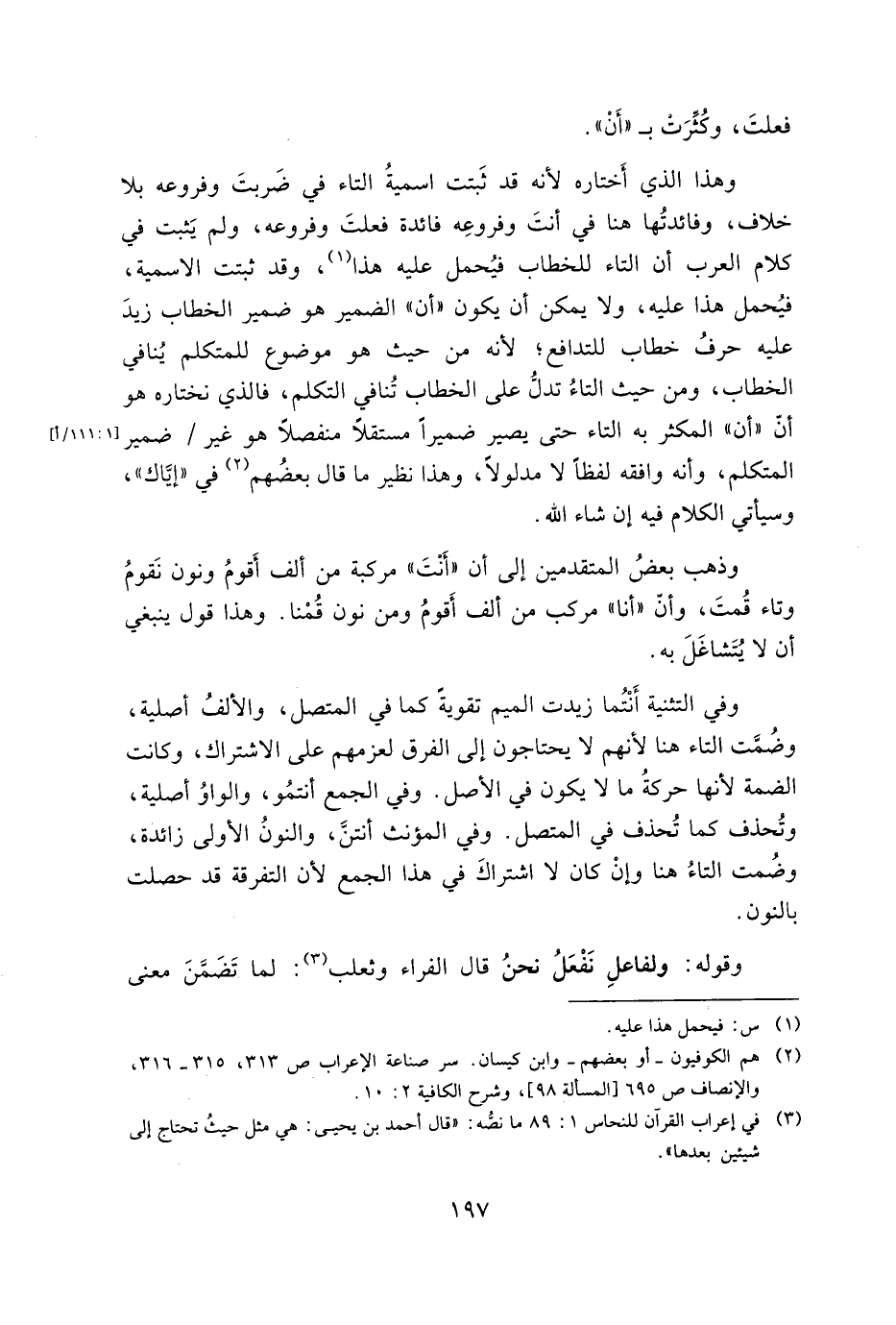 وذهب بعض المتقدمين إلى أن "أنت "مركبة من ألف أقوم ونون نقوم وتاء قمت، وأن "أنا "مركب من ألف أقوم ومن نون قمنا. وهذا قول ينبغي أن لا يتشاغل به.