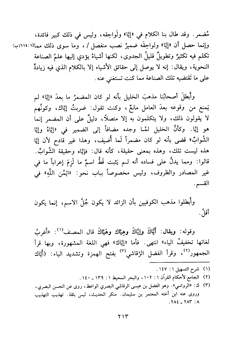 مضمر. وقد طال بنا الكلام في "إيا" ولواحقه، وليس في ذلك كبير فائدة، وإنما حصل أن "إيا" ولواحقه ضمير نصب منفصل/، وما سوي ذلك مما تكلم فيه تكثير وتطويل قليل الجدوي، لكنها أشياء يؤدي إليها علم الصناعة النحوية، ويقال: إنه لا يوصل إلي حقائق الأشياء إلا بالكلام الذي فيه زيادة علي ما تقتضيه تلك الصناعة مما كنت تستغني عنه.
