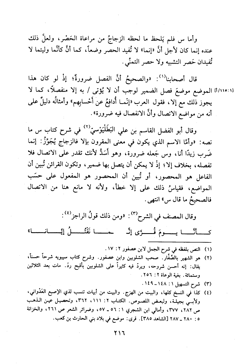 وقال أبو الفضل القاسم بن علي البطليوسي في شرح كتاب س ما نصه: "وأما الاسم الذي يكون في معني المقرون بإلا فالزجاج يجوز: إنما ضرب زيدا أنا، وس جعله ضرورة، وهو أسد لأنك تقدر علي الاتصال فلا تفصله، بخلاف إلا؛ إذ لا يمكن أن يتصل بها ضمير، وتكون القرائن تبين أن الفاعل هو المحصور، أو تبين أن المحصور هو المفعول علي حسب المواضع، فقياس ذلك علي إلا خطأ، ولأنه لا مانع هنا من الاتصال فالصحيح ما قال س" انتهي.
