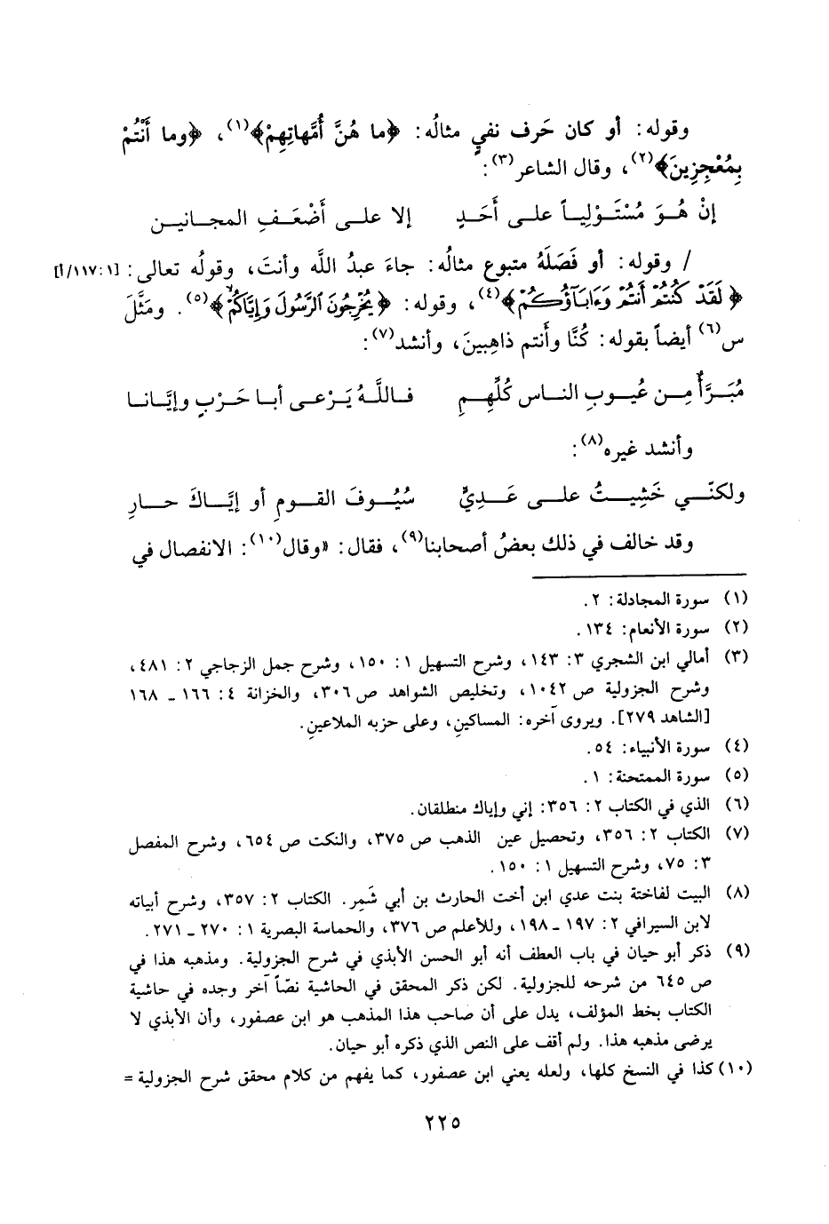وقوله: أو كان حرف نفي مثاله: {ما هُنَّ أُمَّهاتِهِمْ}، {وما أَنْتُمْ بِمُعْجِزِينَ}، وقال الشاعر: