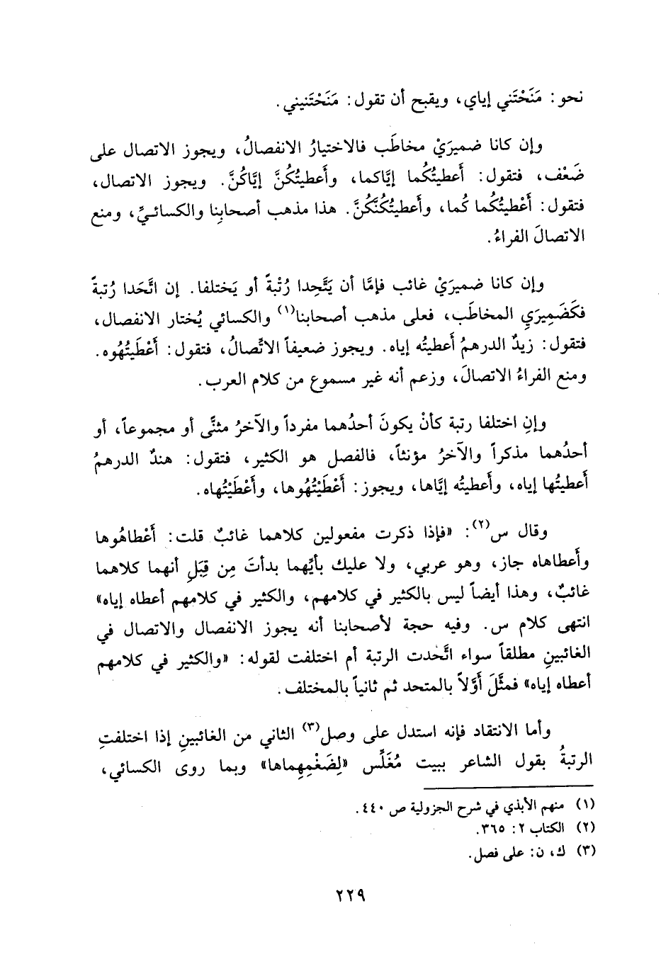 وقال س: "فإذا ذكرت مفعولين كلاهما غائب قلت: أعطاهوها وأعطاهاه جاز، وهو عربي، ولا عليك بأيهما بدأت من قبل أنهما كلاهما غائب، وهذا أيضا ليس بالكثير في كلامهم، والكثير في كلامهم أعطاه إياه" انتهي كلام س. وفيه حجة لأصحابنا أنه يجوز الانفصال والاتصال في الغائبين مطلقا سواء اتحدت الرتبة أم اختلفت لقوله: "والكثير في كلامهم أعطاه إياه" فمثل أولا بالمتحد ثم ثانيا بالمتخلف.