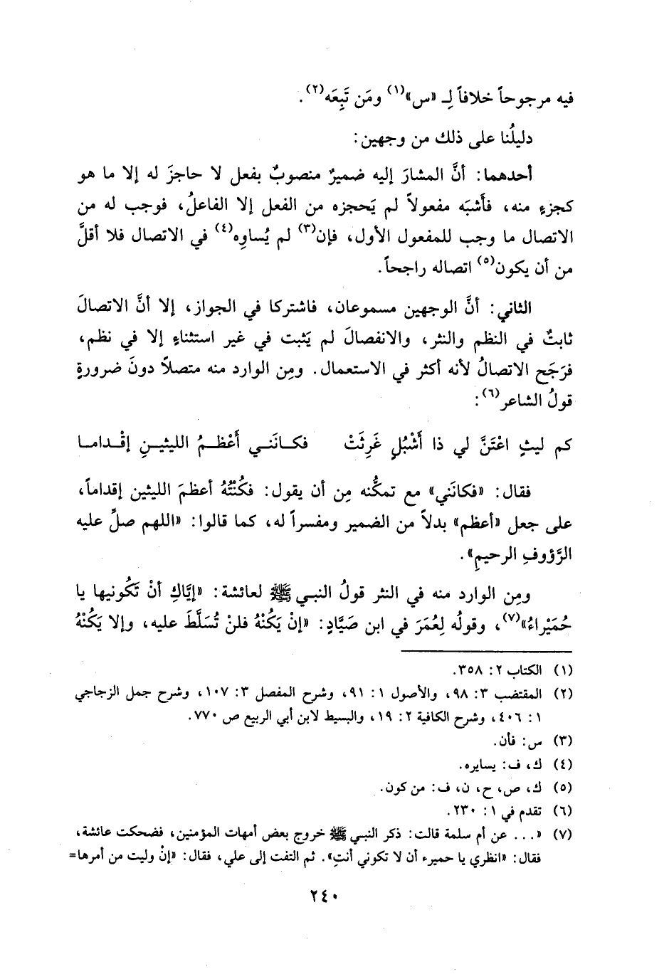 الثاني: أن الوجهين مسموعان، فاشتركا في الجواز، إلا أن الاتصال ثابتٌ في النظم والنثر، والانفصال لم يثبت في غير استثناءٍ إلا في نظم، فرجح الاتصال لأنه أكثر في الاستعمال. ومن الوارد منه متصلًا دون ضرورةٍ قول الشاعر: