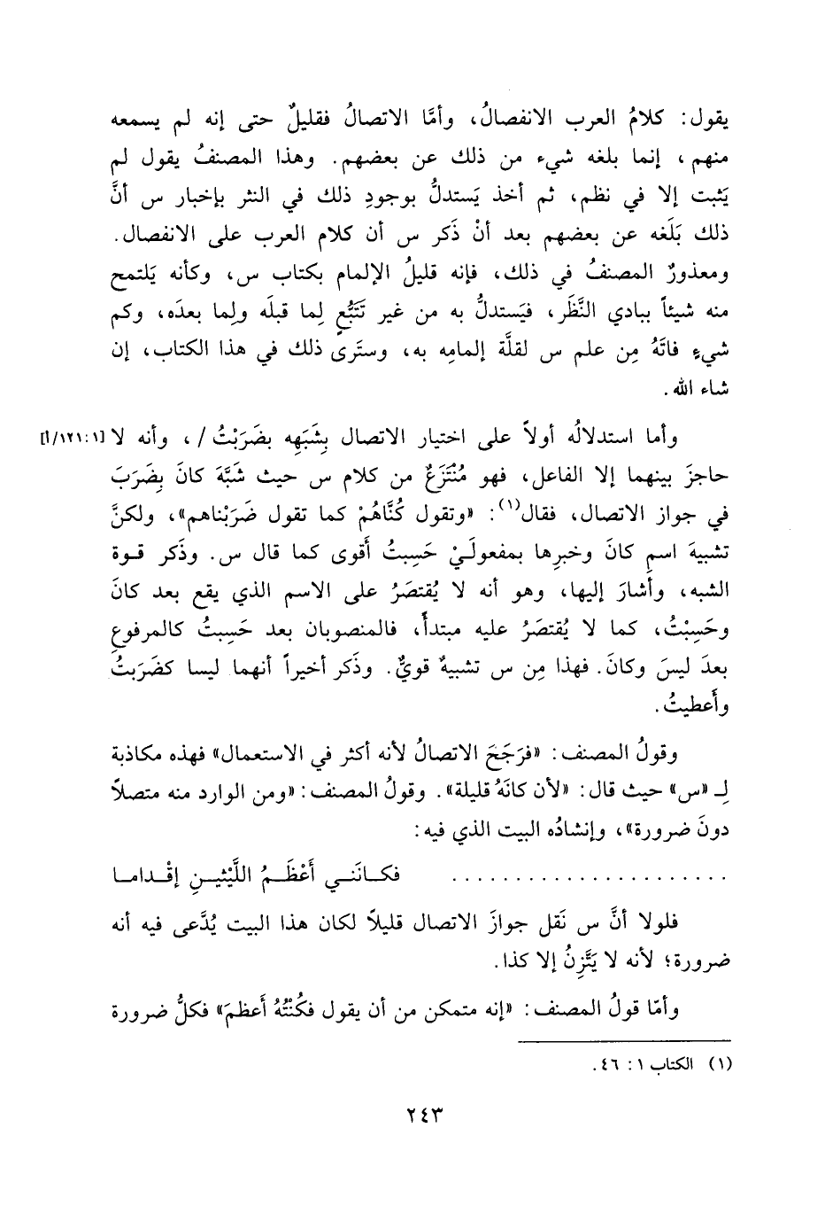 يقول: كلام العرب الانفصال، وأما الاتصال فقليلٌ حتى إنه لم يسمعه منهم، إنما بلغه شيء من ذلك عن بعضهم. وهذا المصنف يقول لم يثبت إلا في نظم، ثم أخذ يستدل بوجود ذلك في النثر بإخبار س أن ذلك بلغه عن بعضهم بعد أن ذكر س أن كلام العرب على الانفصال. ومعذورٌ المصنف في ذلك، فإنه قليل الإلمام بكتاب س، وكأنه يلتمح منه شيئًا ببادي النظر، فيستدل به من غير تتبعٍ لما قبله ولما بعده، وكم شيءٍ فاته من علم س لقلة إلمامه به، وسترى ذلك في هذا الكتاب، إن شاء الله.