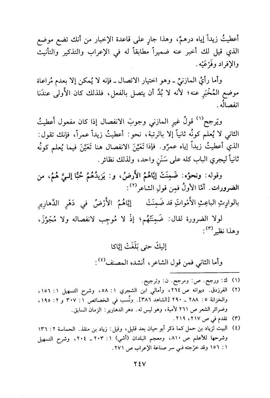 ويرجح قول غير المازني وجوب الانفصال إذا كان مفعول أعطيت الثاني لا يُعلم كونه ثانيًا إلا بالرتبة، نحو: أعطيت زيدًا عمرًا، فإنك تقول: الذي أعطيت زيدًا إياه عمروٌ، فإذا تعين فيما يعلم كونه ثانيًا ليجري الباب كله على سنن واحد، ولذلك نظائر.