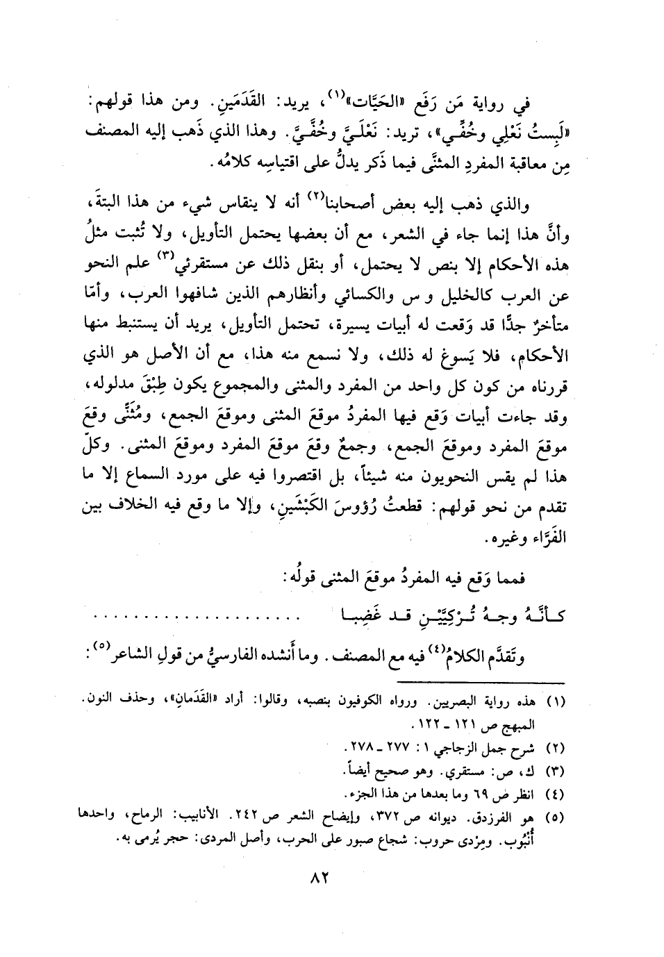 في رواية من رفع "الحيات"، يريد: القدمين. ومن هذا قولهم "لبست نعلي وخفي"، تريد: نعلي وخفي. وهذا الذي ذهب إليه المصنف من معاقبة المفرد المثنى فيما ذكر يدل على اقتباسه كلامه.