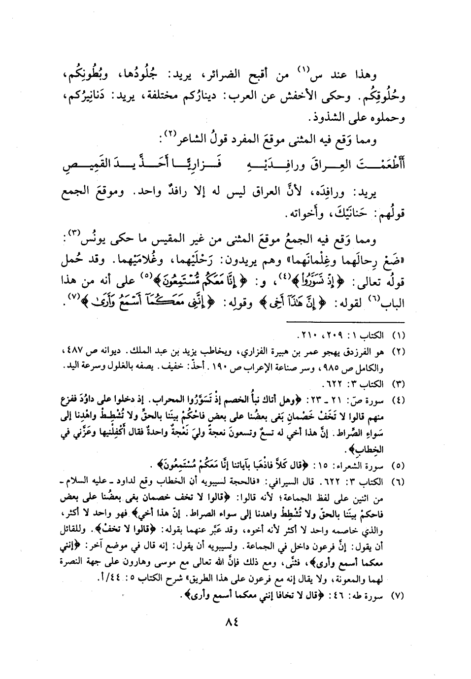 ومما وقع فيه الجمع موقع المثنى من غير المقياس ما حكي يونس: "ضع رحالهما وغلمانهما" وهم يريدون: رحيلهما، وغلاميهما. وقد حمل قوله تعالى: {إِذْ تَسَوَّرُوا}، و: {إِنَّا مَعَكُم مُّسْتَمِعُونَ} على أنه من هذا الباب لقوله: {إِنَّ هَذَا أَخِي} وقوله: {إِنَّنِي مَعَكُمَا أَسْمَعُ وَأَرَى}