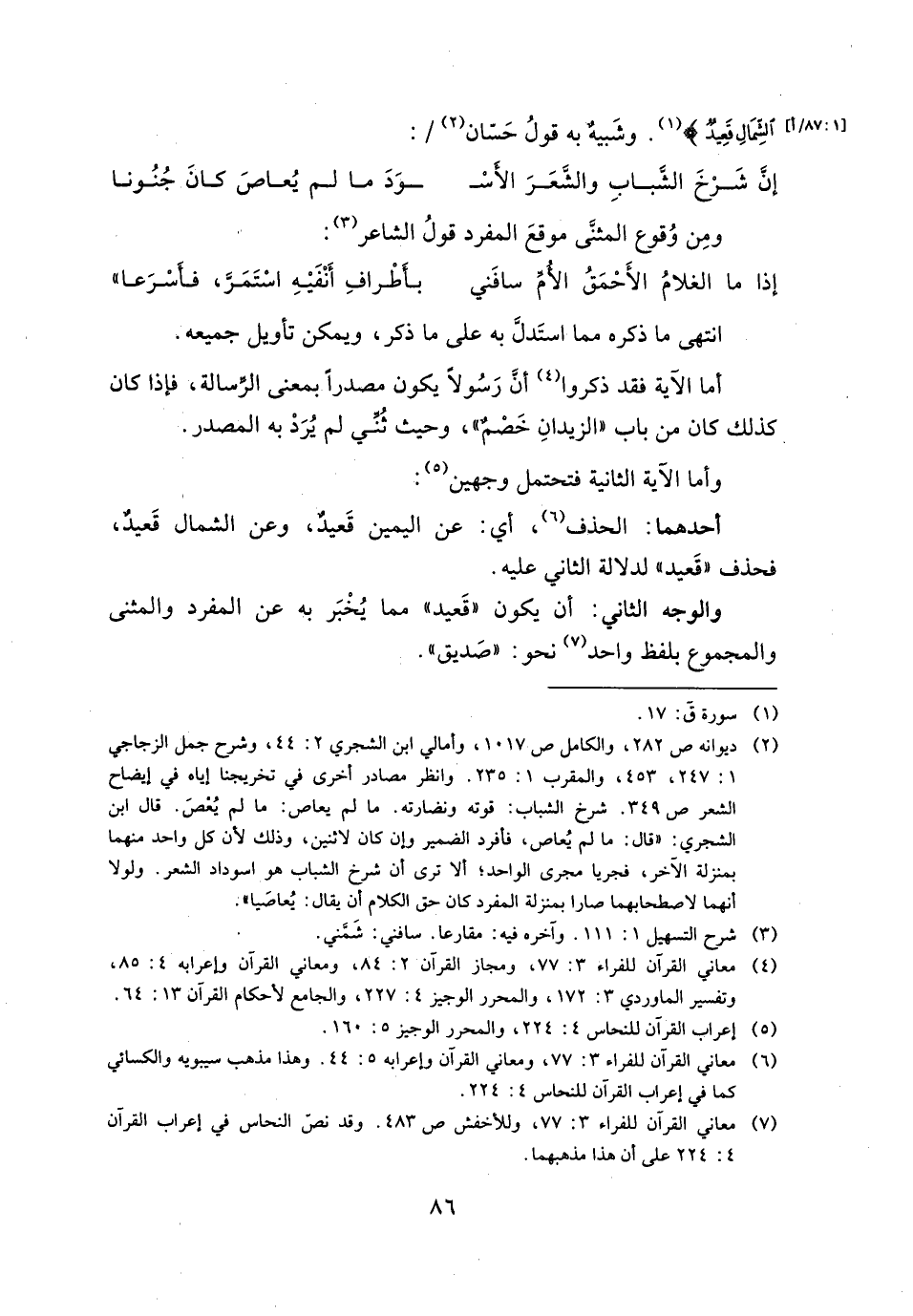 الشِّمَالِ قَعِيدٌ} وشبيها به قول حسان /:
