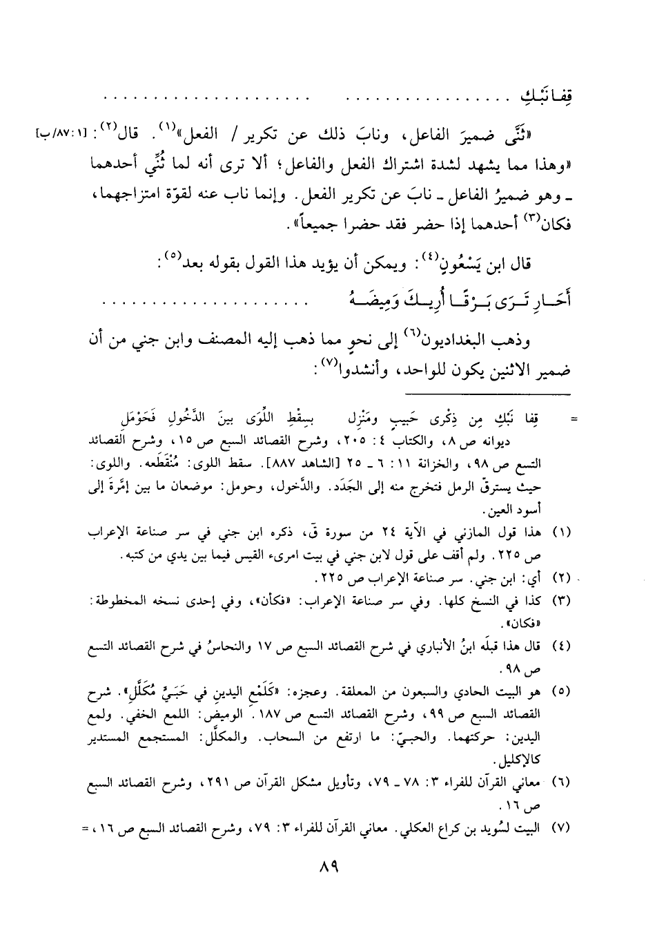"ثنى ضمير الفاعل، وناب ذلك عن تكرير / الفعل". قال: "وهذا مما يشهد لشدة اشتراك الفعل والفاعل؛ ألا ترى أنه لما ثني أحدهما - وهو ضمير الفاعل - ناب عن تكرير الفعل. وإنما ناب عنه لقوة امتزاجهما، فكان أحدهما إذا حضر فقد حضرا جميعاً".