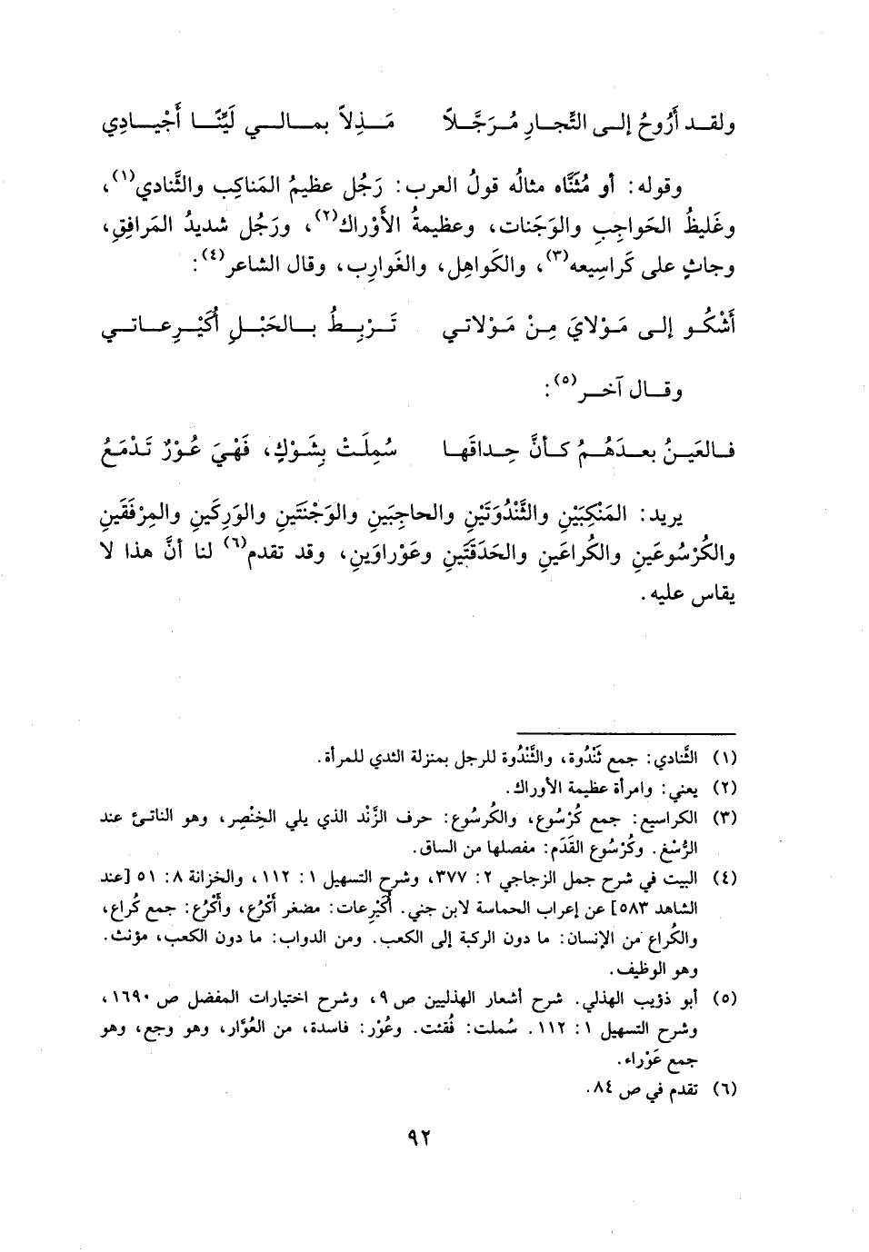 وقوله: أو مثناه مثاله قول العرب: رجل عظيم المناكب والثنادي، وغليظ الحواجب والوجنات، وعظيمة الأوراك، ورجل شديد المرافق، وجاث على كراسيعه، والكواهل، والغوارب، وقال الشاعر: