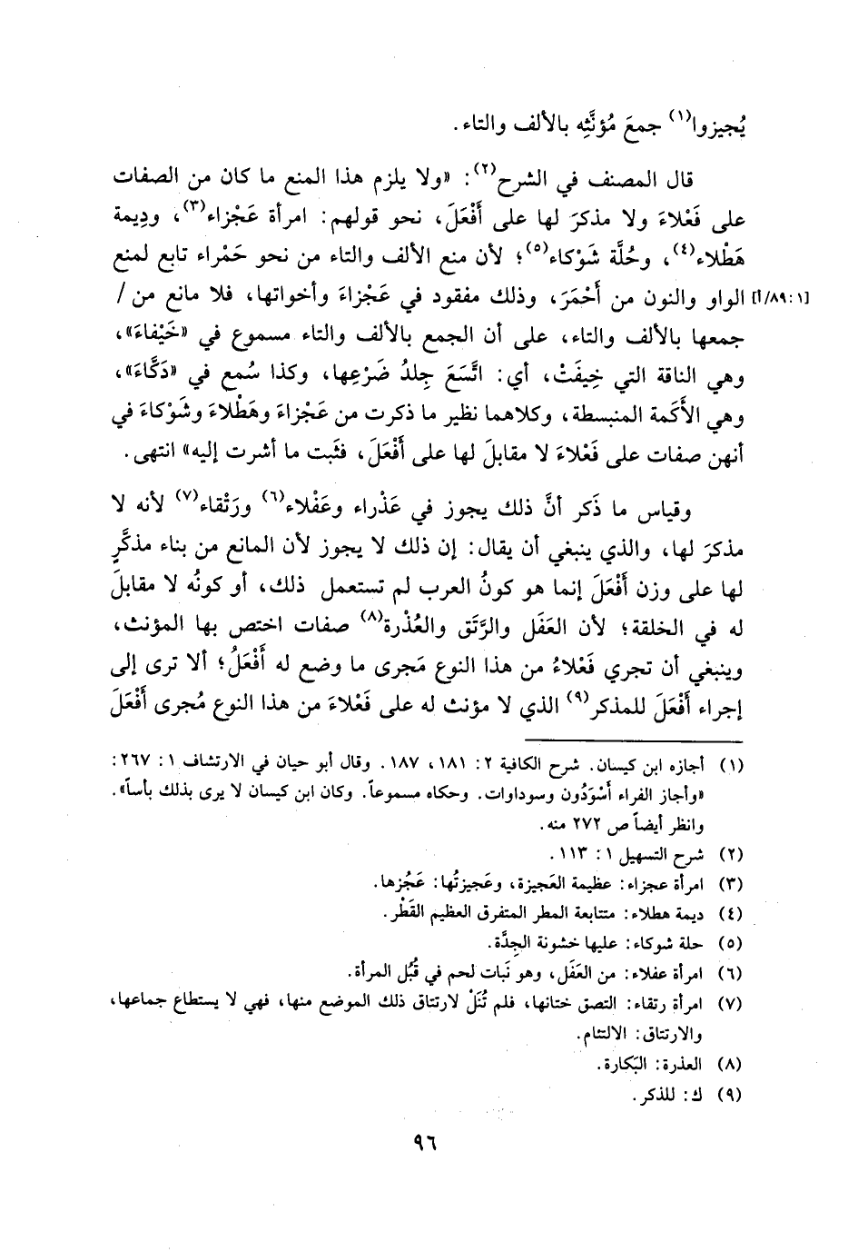 قال المصنف في الشرح: " ولا يلزم هذا المنع ما كان من الصفات على فعلاء ولا مذكر على أفعل، نحو قولهم: امرأة عجزاء، وديمة هطلاء، وحلة شوكاء، لأن منع الألف والتاء من نحو حمراء تابع لمنع الواو والنون من أحمر، وذلك مفقود في عجزاء وأخواتها، فلا مانع من/ جمعها بالألف والتاء، على أن الجمع بالألف والتاء مسموع في "خيفاء" وهي الناقة التي خيفت، أي: اتسع جلد ضرعها، وكذا سمع في "ذكاء" وهي الأكمة المنبسطة وكلاهما نظير ما ذكرت من عجزاء وهطلاء وشوكاء في أنهن صفات على فعلاء لا مقابل لها على أفعل، فثبت ما أشرب إليه" انتهى.
