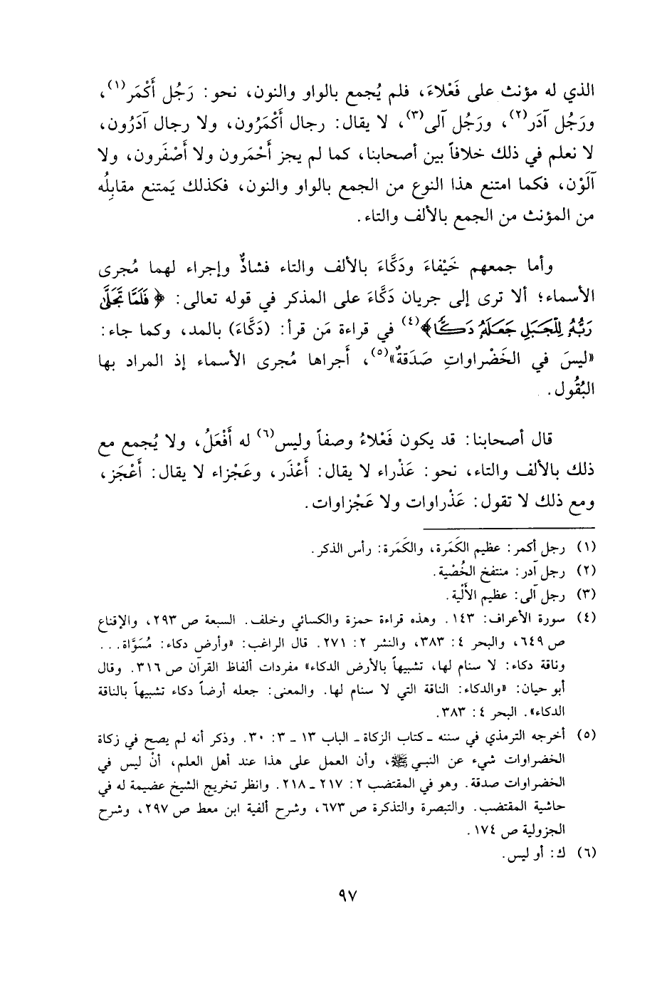 وأما جمعهم خيفاء وداء بالألف والتاء فشاد وإجراء لهما مجرى الأسماء، ألا ترى إلى جريان ذكاء على المذكر في قوله تعالى: {فَلَمَّا تَجَلَّى رَبُّهُ لِلْجَبَلِ جَعَلَهُ دَكّاً} في قراءة من قرأ: (دكاء) بالمد وكما جاء: " ليس في الخضروات صدقة" أجراها مجرى الأسماء إذ المراد بها البقول.