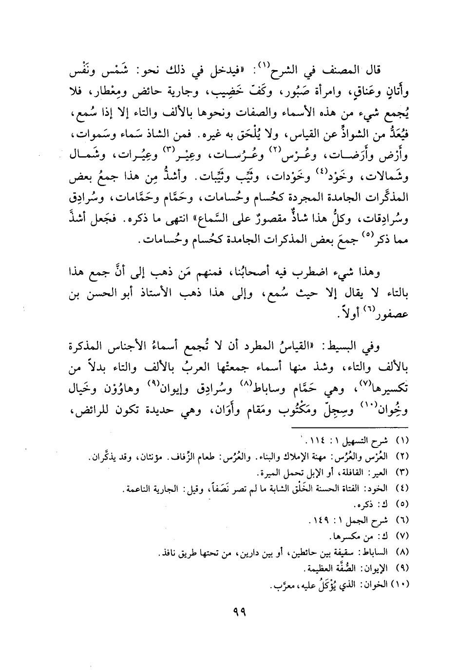 قال المصنف في الشرح: " فيدخل في ذلك نحو: شمس ونفس وأتان وعناق، وامرأة صبور وكف خضيب وجارية حائض ومعطار، فلا يجمع شيء من هذه الأسماء والصفات ونحوها بالألف والتاء إلا إذا سمع، فيعد من الشواذ عن القياس، ولا يلحق به غيره. فمن الشاذ سماء وسموات، وأرض وأرضيات وعرس وعرسات وعير وعيرات، وشمال وشمالات، وخوذ وخوذات، وثيب وثيبات. وأشد من هذا جمع بعض المذكرات الجامدة المجردة كحسام وحسامات، وحمام وحمامات، وسرادق وسرادقات، وكل هذا مقصور على السماع" انتهى ما ذكره، فجعل أشذ مما ذكر جمع بعض المذكرات الجامدة كحسام وحسامات.