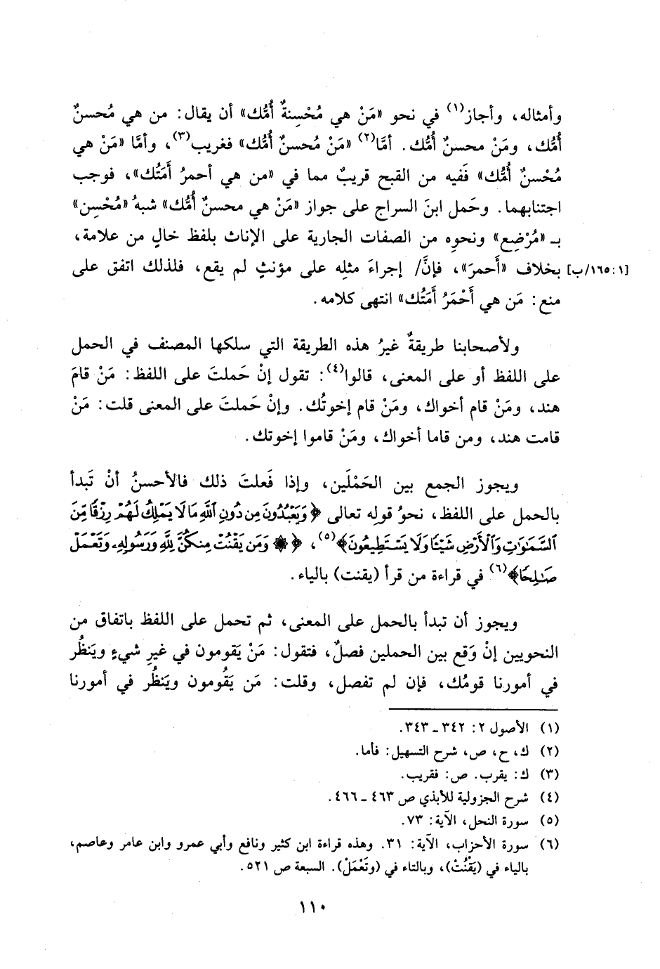 ويجوز أن تبدأ بالحمل على المعنى، ثم تحمل على اللفظ باتفاق من النحويين إن وقع بين الحملين فصل، فتقول: من يقومون في غير شيء وينظر في أمورنا قومك، فإن لم تفصل، وقلت: من يقومون وينظر في أمورنا
