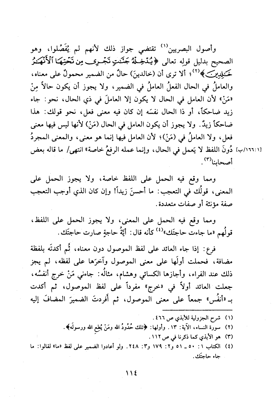 وأصول البصريين تقتضي جواز ذلك لأنهم لم يفصلوا، وهو الصحيح بدليل قوله تعالى {يُدْخِلْهُ جَنَّاتٍ تَجْرِي مِن تَحْتِهَا الأَنْهَارُ خَالِدِينَ}؛ ألا ترى أن (خالدين) حال من الضمير المحمول على معناه، والعامل في الحال الفعل العامل في الضمير، ولا يجوز أن يكون حالًا من "من" لأن العامل في الحال لا يكون إلا العامل في ذي الحال، نحو: جاء زيد ضاحكًا، أو ذا الحال نفسه إن كان فيه معنى فعل، نحو قولك: هذا ضاحكًا زيد. ولا يجوز أن يكون العامل في الحال (من) لأنها ليس فيها معنى فعل، ولا العامل في (من)؛ لأن العامل فيها إنما هو معنى، والمعنى المجرد دون اللفظ لا يعمل في الحال، وإنما عمله الرفع خاصة" انتهى/ ما قاله بعض أصحابنا.
