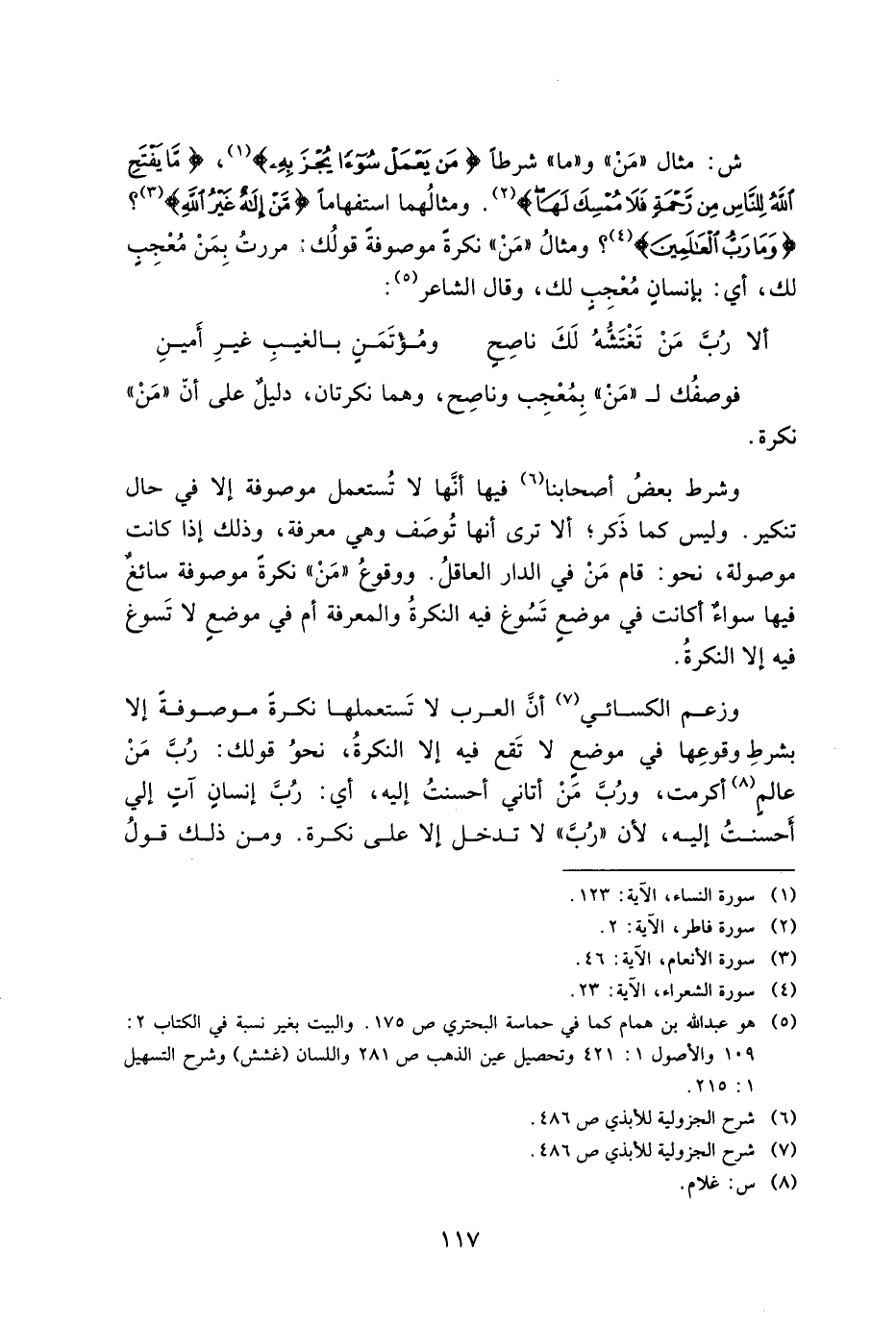 ش: مثال "من" و"ما" شرطًا {مَن يَعْمَلْ سُوءًا يُجْزَ بِهِ}، {مَا يَفْتَحِ اللَّهُ لِلنَّاسِ مِن رَّحْمَةٍ فَلا مُمْسِكَ لَهَا}. ومثالهما استفهامًا {مَّنْ إلَهٌ غَيْرُ اللَّهِ}؟ {ومَا رَبُّ العَالَمِينَ}؟ ومثال "من" نكرة موصوفة قولك: مررت بمن معجب لك، أي: بإنسان معجب لك، وقال الشاعر: