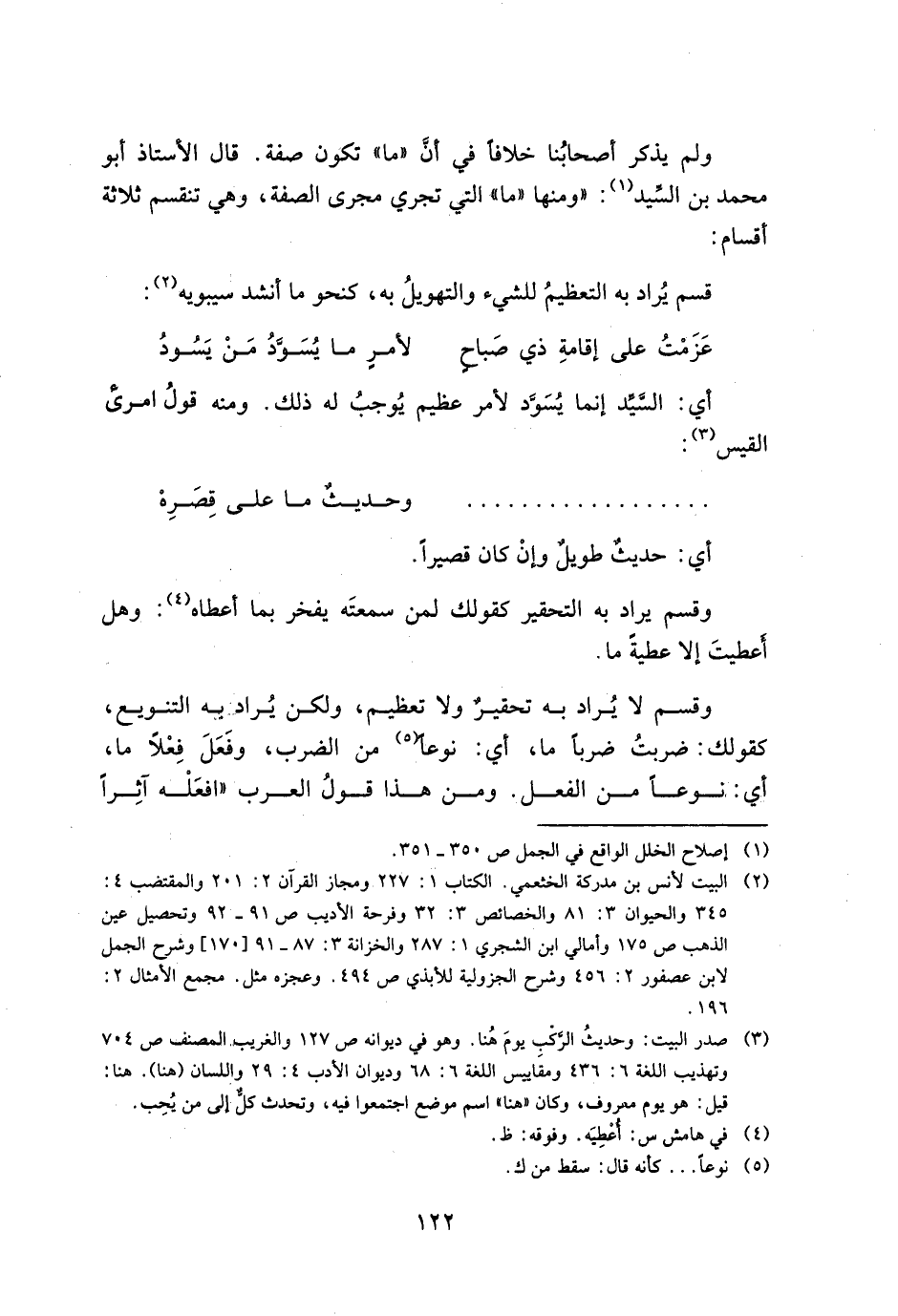 ولم يذكر أصحابنا خلافًا في أن "ما" تكون صفة. قال الأستاذ أبو محمد بن السيد: "ومنها "ما" التي تجري مجرى الصفة، وهي تنقسم ثلاثة أقسام: