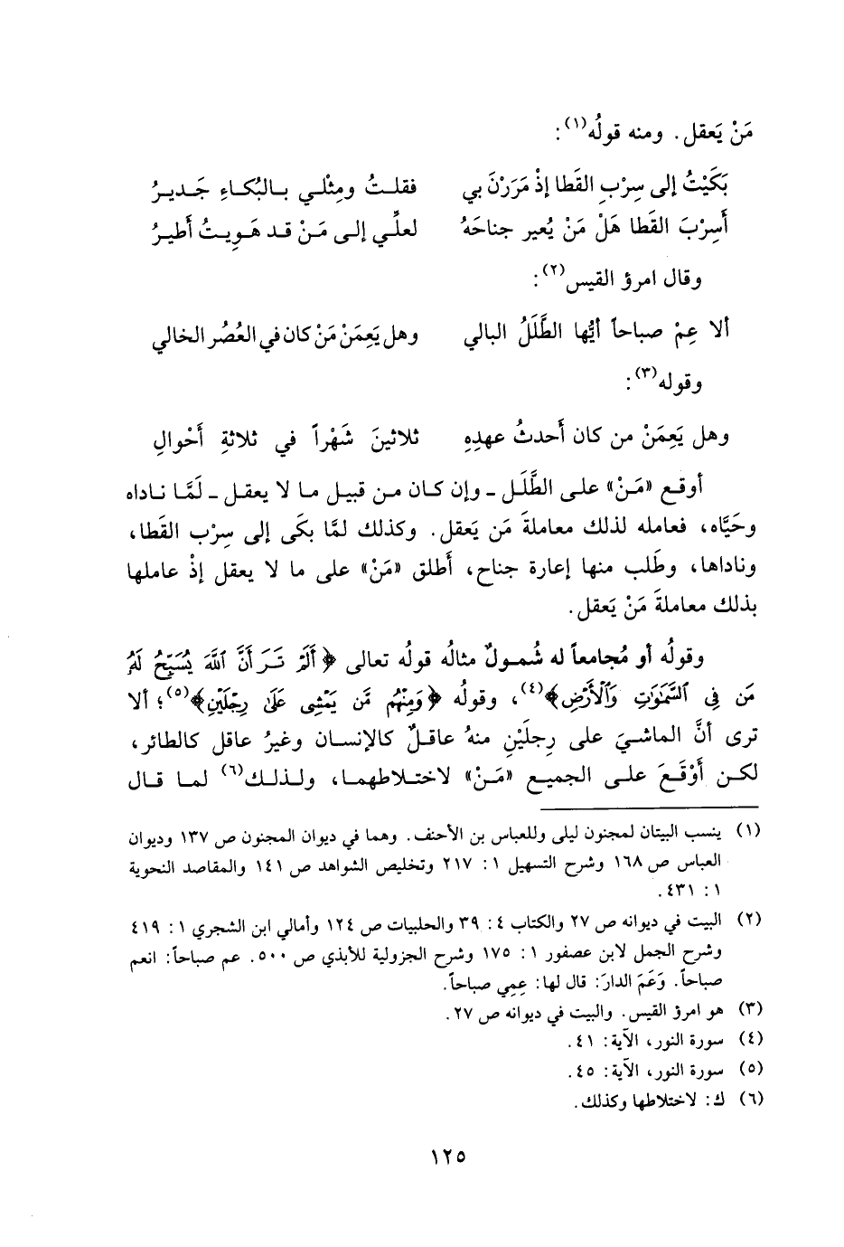 أوقع "من" على الطلل -وإن كان من قبيل ما لا يعقل- لما ناداه وحياه، فعالمه لذلك معاملة من يعقل. وكذلك لما بكى إلى سرب القطا، وناداها، وطلب منها إعارة جناح، أطلق "من" على ما لا يعقل إذ عاملها بذلك معاملة من يعقل.