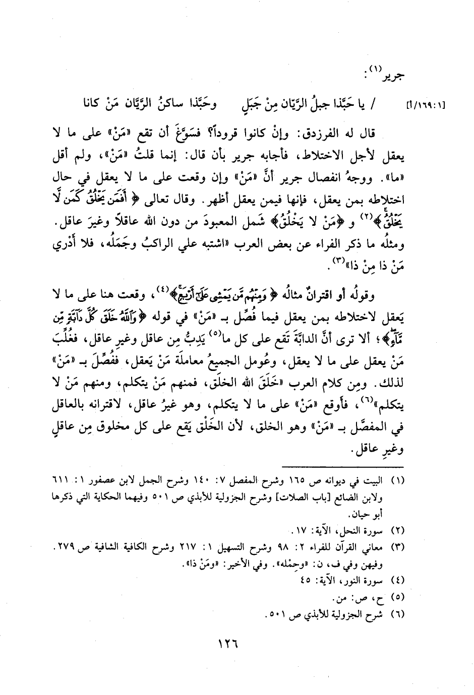 قال له الفرزدق: وإن كانوا قرودًا؟ فسوغ أن تقع "من" على ما لا يعقل لأجل الاختلاط، فأجابه جرير بأن قال: إنما قلت "من"، ولم أقل "ما". ووجه انفصال جرير أن "من" وإن وقعت على ما لا يعقل في حال اختلاطه بمن يعقل، فإنها فيمن يعقل أظهر. وقال تعالى {أَفَمَن يَخْلُقُ كَمَن لاَّ يَخْلُقُ} و {مَن لاَّ يَخْلُقُ} شمل المعبود من دون الله عاقلًا وغير عاقل. ومثله ما ذكر الفراء عن بعض العرب "اشتبه على الراكب وجمله، فلا أدري من ذا من ذا".