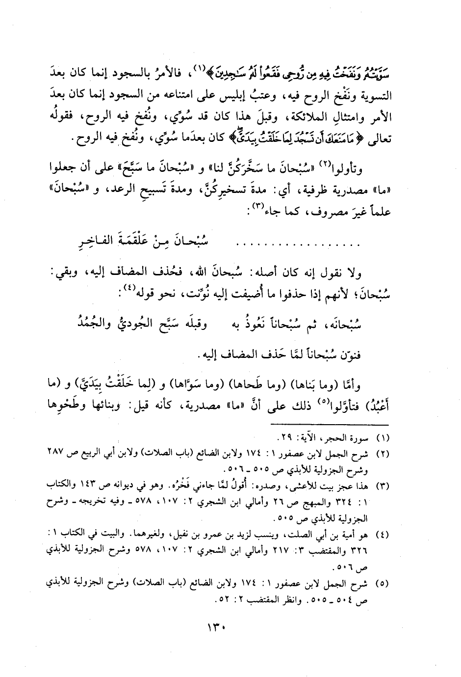 وتأولوا "سبحان ما سخركن لنا" و"سبحان ما سبح" على أن جعلوا "ما" مصدرية ظريفة، أي: مدة تسخيركن، ومدة تسبيح الرعد، و"سبحان" علمًا غير مصروف، كما جاء: