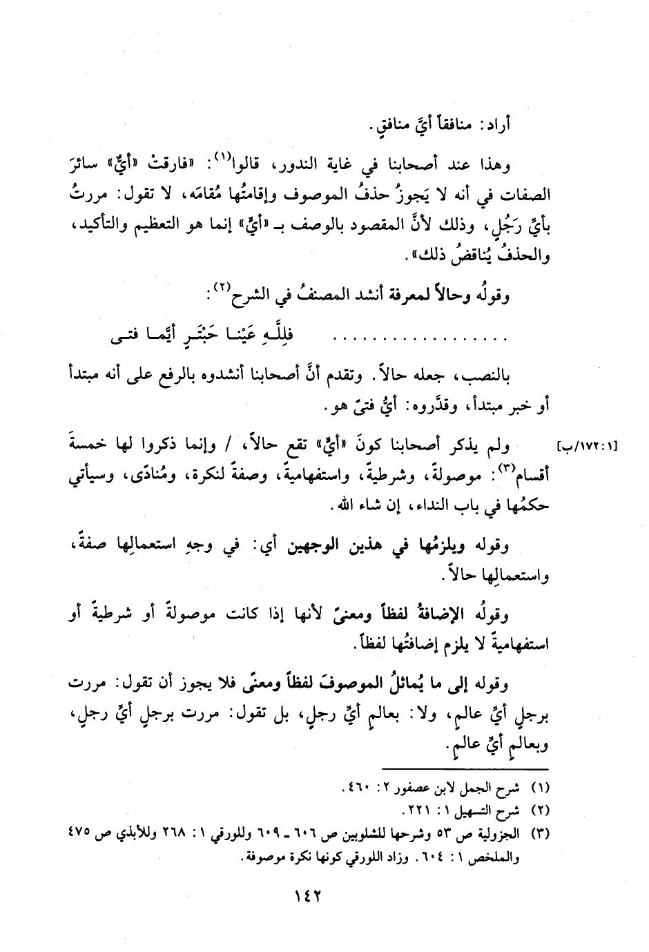 ولم يذكر أصحابنا كون "أي" تقع حالًا،/ وإنما ذكروا لها خمسة أقسام: موصولة، وشرطية، واستفهامية، وصفة لنكرة، ومنادى، وسيأتي حكمها في باب النداء، إن شاء الله.