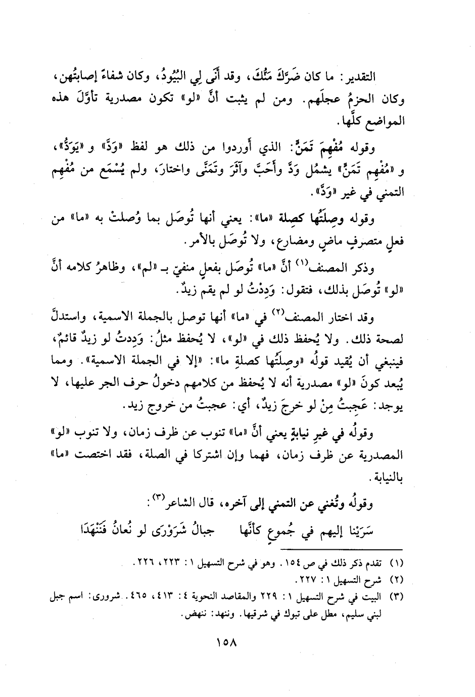 وقد اختار المصنف في "ما" أنها توصل بالجملة الاسمية، واستدل لصحة ذلك. ولا يُحفظ ذلك في "لو"، لا يُحفظ مثل: وددت لو زيدٌ قائمٌ، فينبغي أن يُقيد قوله "وصلتها كصلة ما": "إلا في الجملة الاسمية". ومما يُبعد كون "لو" مصدرية أنه لا يُحفظ من كلامهم دخول حرف الجر عليها، لا يوجد: عجبت من لو خرج زيدٌ، أي: عجبت من خروج زيد.