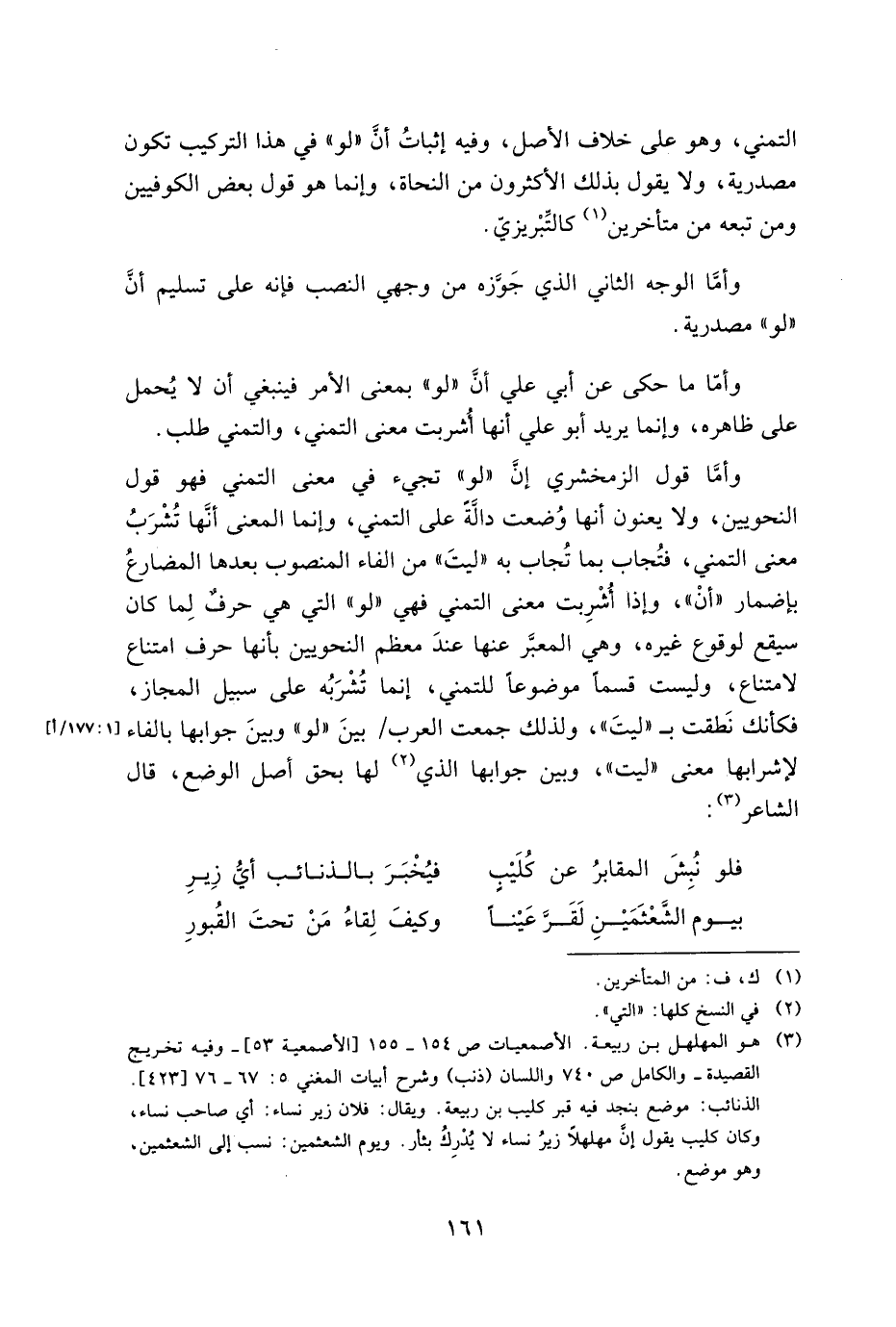 وأما قول الزمخشري إن "لو"س تجيء في معنى التمني فهو قول النحويين، ولا يعنون أنها وُضعت دالةً على التمني، وإنما المعنى أنها تُشرب معنى التمني، فتُجاب بما تُجاب به "ليت" من الفاء المنصوب بعدها المضارع بإضمار "أن"، وإذا أُشربت معنى التمني فهي "لو" التي هي حرفٌ لما كان سيقع لوقوع غيره، وهي المعبر عنها عند معظم النحويين بأنها حرف امتناع لامتناع، وليست قسمًا موضوعًا للتمني، إنما تُشربه على سبيل المجاز، فكأنك نطقت بـ "ليت"، ولذلك جمعت العرب/ بين "لو" وبين جوابها بالفاء لإشرابها معنى "ليت"، وبين جوابها الذي لها بحق أصل الوضع، قال الشاعر: