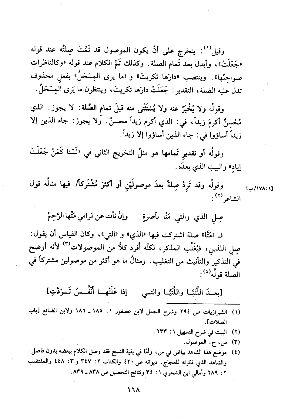 فـ "متا" صلة اشتركت فيها "الذي" و "التي"، وكان القياس أن يقول: صل اللذين، فيُغلب المذكر، لكنه أفرد كلًا من الموصولات لأنه أوضح في التذكير والتأنيث من التغليب. ومثال ما هو أكثر من موصولين مشتركًا في الصلة: