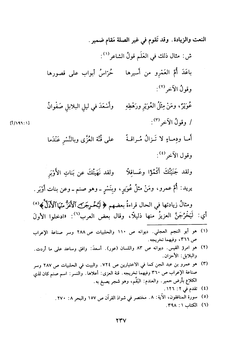 ومثال زيادتها في الحال قراءة بعضهم {لَيُخْرِجَنَّ الأَعَزُّ مِنْهَا الأَذَلَّ} أي: ليخرجن العزيز منها ذليلاً وقال بعض العرب:" ادخلوا الأول