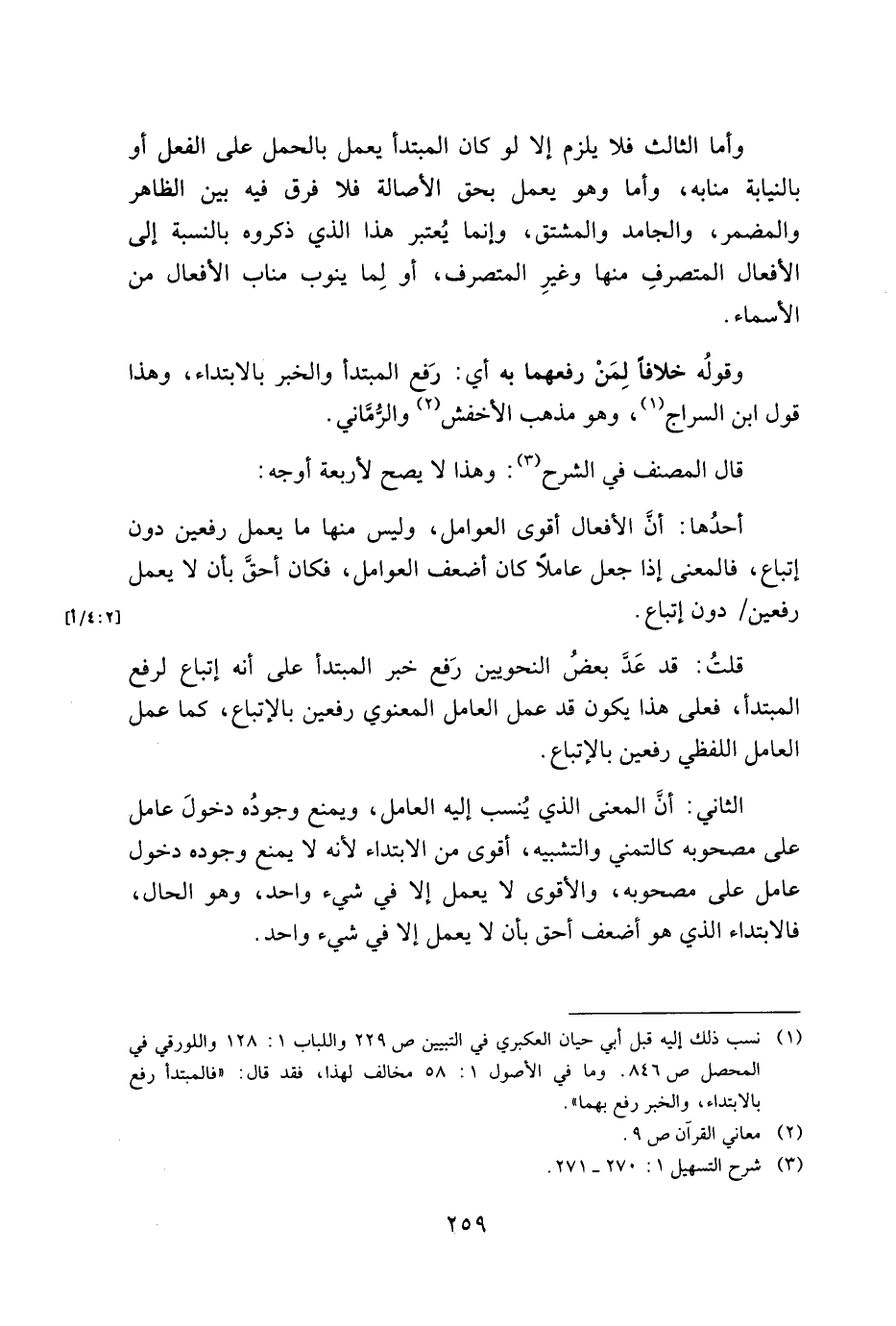 وأما الثالث فلا يلزم إلا لو كان المبتدأ يعمل بالحمل على الفعل أو بالنيابة منابه، وأما وهو يعمل بحق الأصالة فلا فرق فيه بين الظاهر والمضمر، والجامد والمشتق، وإنما يعتبر هذا الذي ذكروه بالنسبة إلى الأفعال المتصرف منها وغير المتصرف، أو لما ينوب مناب الأفعال من الأسماء.