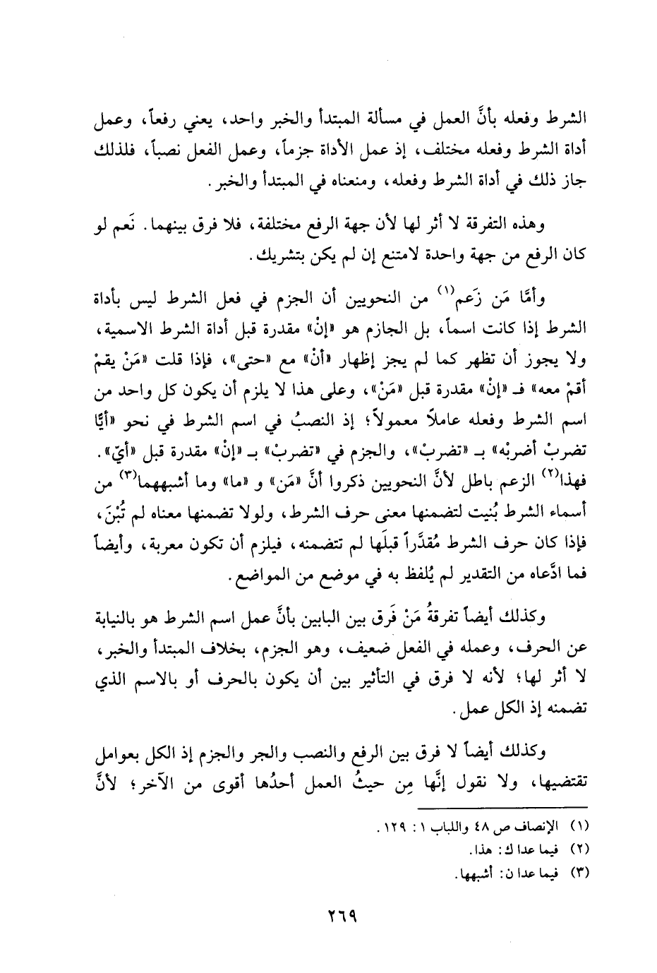 وكذلك أيضًا تفرقة من فرق البابين بأن عمل اسم الشرط هو بالنيابة عن الحرف، وعمله في الفعل ضعيف، وهو الجزم، بخلاف المبتدأ والخبر، لا أثر لها؛ لأنه لا فرق في التأثير بين أن يكون بالحرف أو بالاسم الذي تضمنه إذ الكل عمل.