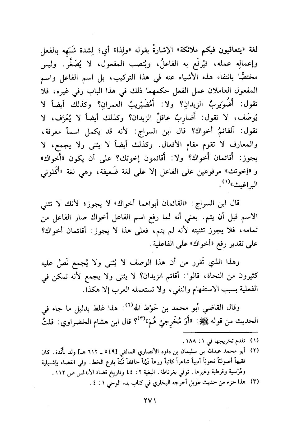 لغة "يتعاقبون فيكم ملائكة "الإشارة بقوله "ولذا "أي؛ لشدة شبهه بالفعل وإعماله عمله، فيرفع به الفاعل، وينصب المفعول، لا يصغر. وليس مختصًا بانتفاء هذه الأشياء عنه في هذا التركيب، بل اسم الفاعل واسم المفعول العاملان عمل الفعل حكمهما ذلك في هذا الباب وفي غيره، فلا تقول: أضويرب الزيدان؟ ولا: أمضيريب العمران؟ وكذلك أيضًا لا يوصف، لا تقول: أضارب عاقل الزيدان؟ وكذلك أيضًا لا يعرف، لا تقول: القائم أخواك؟ قال ابن السراج: لأنه قد يكمل اسمًا معرفة، والمعارف لا تقوم مقام الأفعال. وكذلك أيضًا لا يثنى ولا يجمع، لا يجوز: أقائمان أخواك؟ ولا: أقائمون إخوتك؟ على أن يكون "أخواك "و "إخوتك "مرفوعين على الفاعل إلا على لغة ضعيفة، وهي لغة "أكلوني البراغيث ".