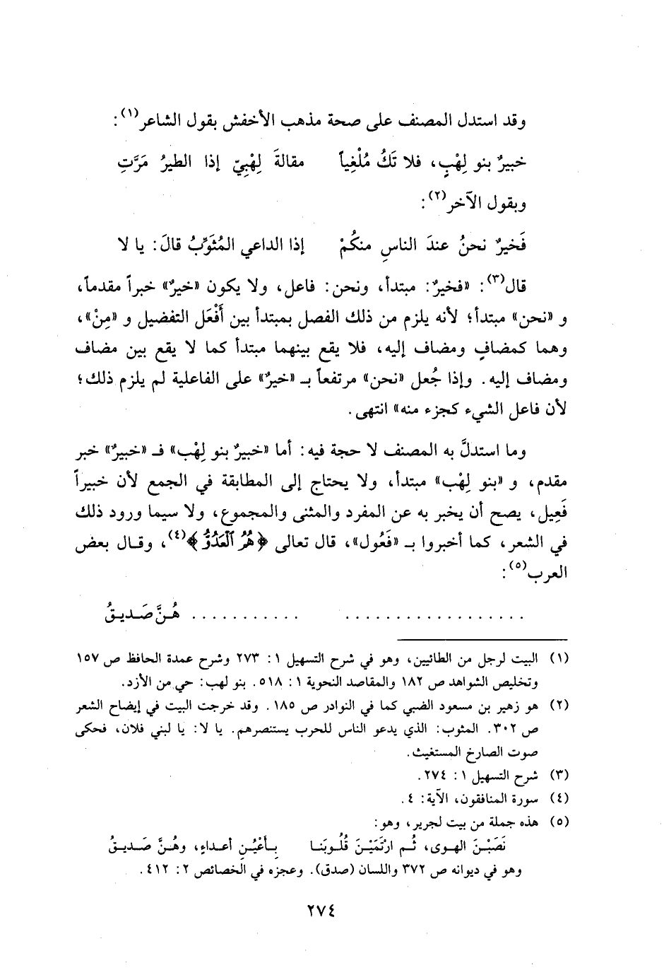 وما استدل به المصنف لا حجة فيه: أما "خبير بنو لهب "فـ "خبير "خبر مقدم، و"بنو لهب " مبتدأ، ولا يحتاج إلى المطابقة في الجمع لأن خبيرًا فعيل، يصح أن يخبر به عن المفرد والمثنى والمجموع، ولاسيما ورود ذلك في الشعر، كما أخبروا بـ "فعول "، قال تعالى {هُمُ الْعَدُوُّ}، وقال بعض العرب: