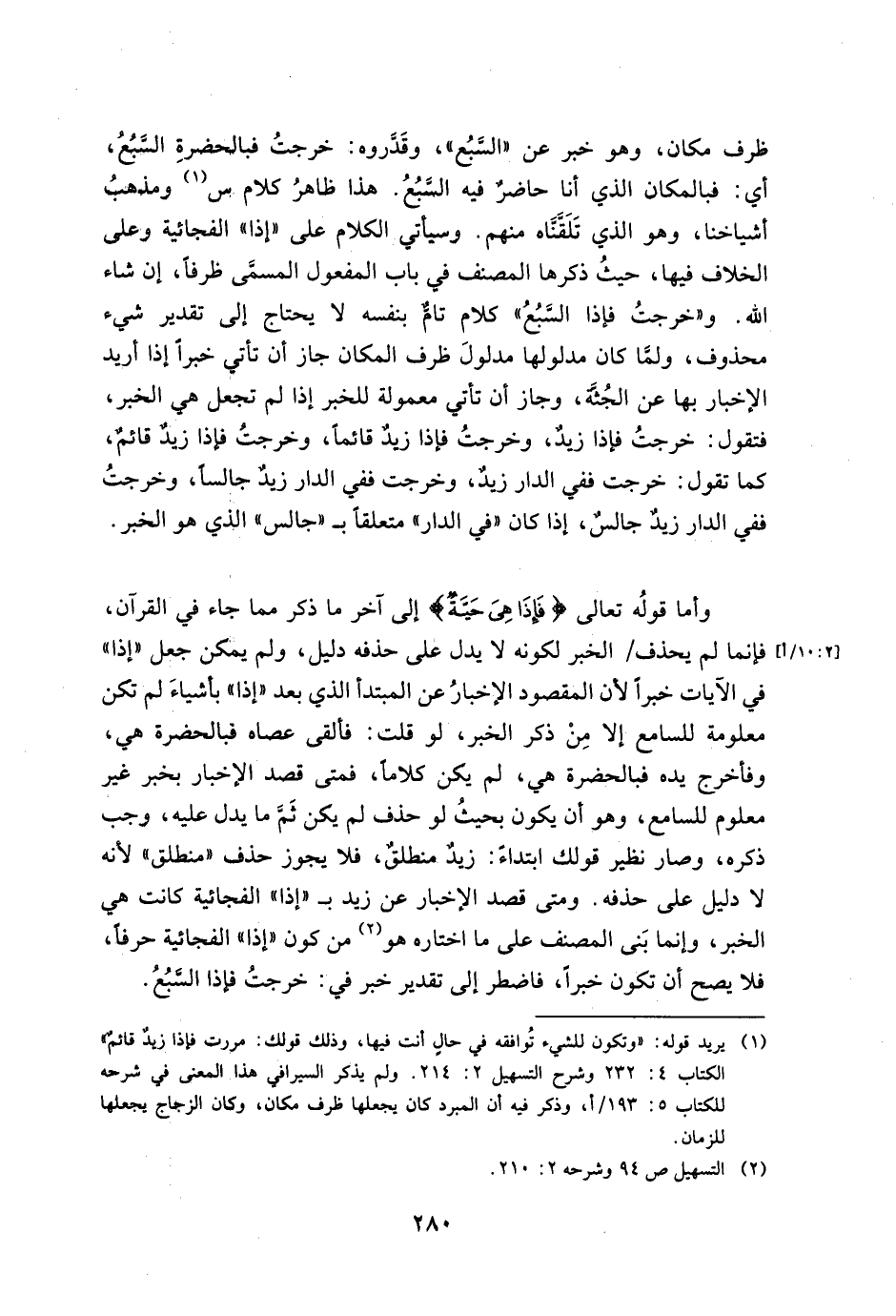 ظرف مكان، وهو خبر عن "السبع "، وقدروه: خرجت فبالحضرة السبع، أي: فبالمكان الذي أنا حاضر فيه السبع. هذا ظاهر كلام س ومذهب أشياخنا، وهو الذي تلقناه منهم. وسيأتي الكلام على "إذا "الفجائية وعلى الخلاف فيها، حيث ذكرها المصنف في باب المفعول المسمى ظرفًا، إن شاء الله. و "خرجت فإذا السبع "كلام تام بنفسه لا يحتاج إلى تقدير شيء محذوف، ولما كان مدلولها ظرف المكان جاز أن تأتي خبرًا إذا أريد الإخبار بها عن الجثة، وجاز أن تأتي معمولة للخبر إذا لم تجعل هي الخبر، فتقول: خرجت فإذا زيد، وخرجت فإذا زيد قائمًا، وخرجت فإذا زيد قائم، كما تقول: خرجت ففي الدار زيد، وخرجت ففي الدار زيد جالسًا، وخرجت ففي الدار زيد جالس، إذا كان "في الدار "متعلقًا بـ "جالس "الذي هو الخبر.
