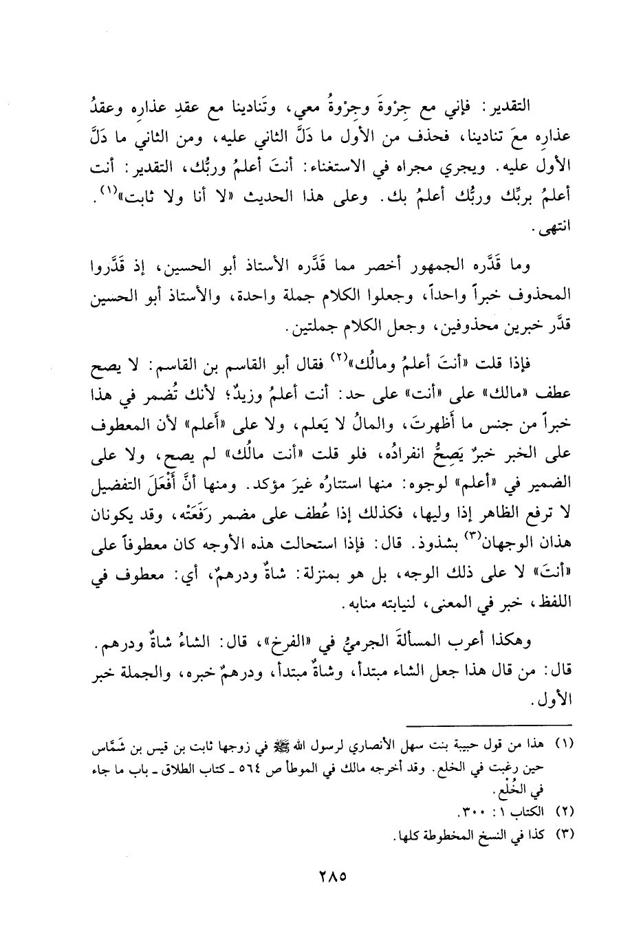 فإذا قلت "أنت أعلم ومالك" فقال أبو القاسم بن القاسم: لا يصح عطف "مالك" على "أنت" على حد: أنت أعلم وزيد؛ لأنك تضمر في هذا خبرًا من جنس ما أظهرت، والمال لا يعلم، ولا على "أعلم" لأن المعطوف على الخبر خبر يصح انفراده، فلو قلت "أنت مالك" لم يصح، ولا على الضمير في "أعلم" لوجوه: منها استتاره غير مؤكد. ومنها أن أفعل التفضيل لا ترفع الظاهر إذا وليها، فكذلك إذا عطف على مضمر رفعته، وقد يكونان هذان الوجهان بشذوذ. قال: فإذا استحالت هذه الأوجه كان معطوفًا على "أنت" لا على ذلك الوجه، بل هو بمنزلة: شاة ودرهم، أي: معطوف في اللفظ، خبر في المعنى، لنيابته منابه.