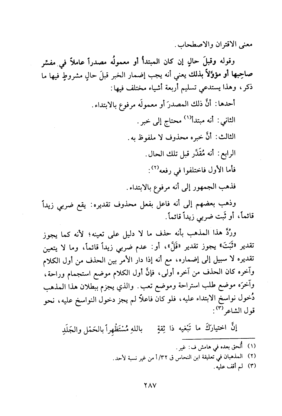 وقوله وقبل حاٍل إن كان المبتدأ أو معمولة مصدرًا عاملًا في مفسر صاحبها أو مؤولًا بذلك يعني أنه يجب إضمار الخبر قبل حاٍل مشروٍط فيها ما ذكر، وهذا يستدعي تسليم أربعة أشياء مختلف فيها: