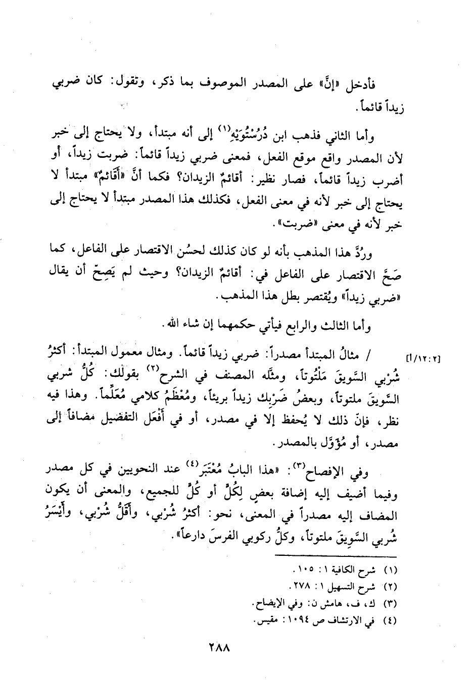 وأما الثاني فذهب ابن درستويه إلى أنه مبتدأ، ولا يحتاج إلى خبر لأن المصدر واقع موقع الفعل، فمعنى ضربي زيدًا قائمًا: ضربت زيدًا، أو أضرب زيدًا قائمًا، فصار نظير: أقائم الزيدان؟ فكما أن "أقائم" مبتدأ لا يحتاج إلى خبر لأنه في معنى الفعل، فكذلك هذا المصدر مبتدأ لا يحتاج إلى خبر لأنه في معنى "ضربت".