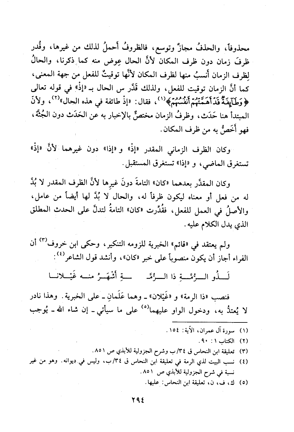 محذوفاً، والحذف وتوسع، فالظروف أحمل لذلك من غيرها، وقدر ظرف زمان دون ظرف المكان لأن الحال عوض منه كما ذكرنا، والحال لظرف الزمان أنسب منها لظرف المكان لأنها توقيت للفعل من جهة المعنى، كما أن الزمان توقيت للفعل، ولذلك قدر س الحال بـ "إذا" في قوله تعالى: {وطَائِفَةٌ قَدْ أَهَمَّتْهُمْ أَنفُسُهُمْ}، فقال: "إذ طائفة في هذه الحال"، ولأن المبتدأ هنا حدث، وظرف الزمان مختص بالإخبار به عن الحدث دون الجثة، فهو أخص به من ظرف المكان.