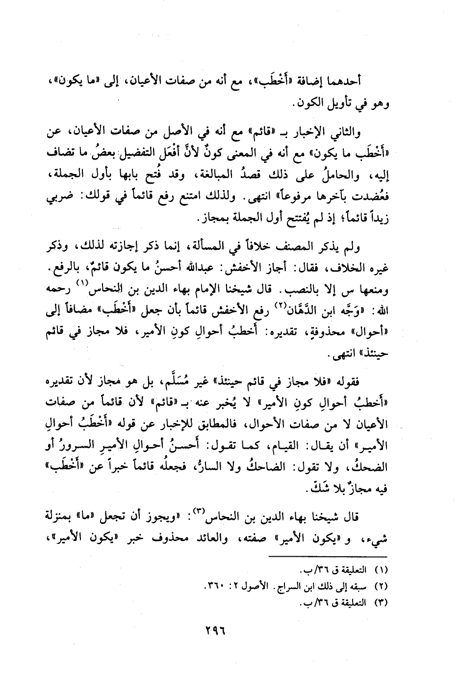 ولم يذكر المصنف خلافاً في المسألة، إنما ذكر إجازته لذلك، وذكر غيره الخلاف، فقال: أجاز الأخفش: عبد الله أحسن ما يكون قائم، بالرفع ومنعها س إلا بالنصب. قال شيخنا الإمام بهاء الدين بن النحاس رحمه الله: "وجه ابن الدهان رفع الأخفش قائماً بأن جعل "أخطب" مضافاً إلى "أحوال" محذوفة، تقديره: أخطب أحوال كون الأمير، فلا مجاز في قائم حينئذ" انتهى.