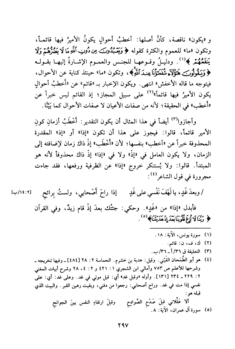 وأجازوا أيضاً في هذا المثال أن يكون التقدير: أخطب أزمان كون الأمير قائماً، قالوا: فيجوز على هذا أن تكون "إذا" أو "إذ" المقدرة المحذوفة خبراً عن "أخطب" بنفسها، لأن "أخطب" إذ ذاك زمان لإضافته إلى الزمان، ولا يكون العامل في "إذا" ولا في "إذا" إذ ذاك محذوفاً لأنه هو المبتدأ. قالوا: ولا يستنكر خروج "إذا" عن الظرفية ورفعها، فقد جاءت مجرورة في قول الشاعر: