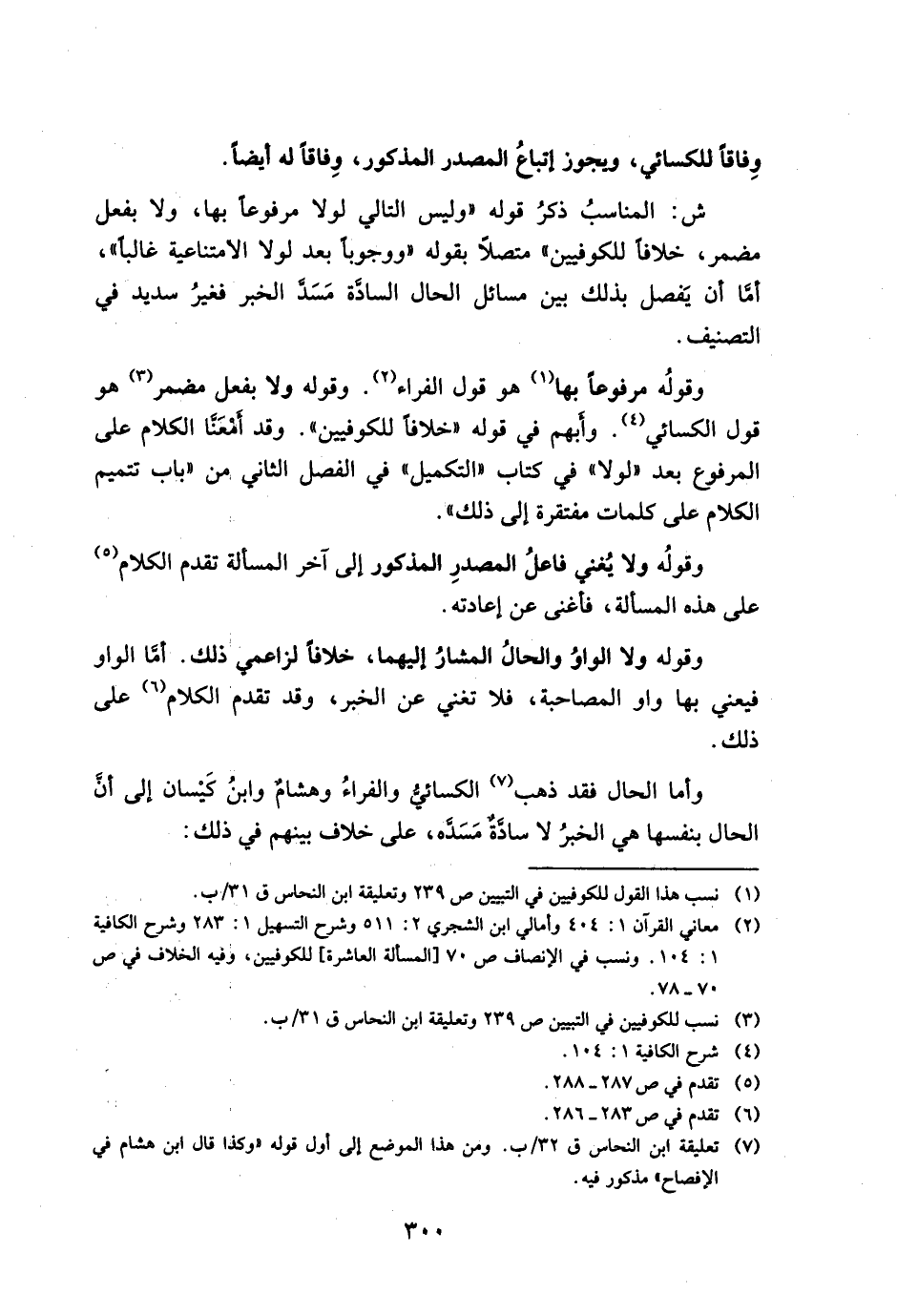 ش: المناسب ذكر قوله "وليس التالي لولا مرفوعاً بها، ولا بفعل مضمر، خلافاً للكوفيين" متصلاً بقوله "ووجوباً بعد لولا الامتناعية غالباً"، أما أن يفصل بذلك بين مسائل الحال السادة مسد الخبر فغير سديد في التصنيف.