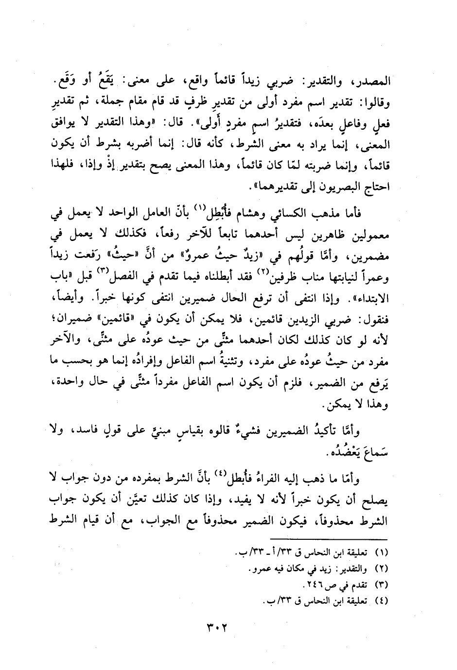 فأما مذهب الكسائي وهشام فأبطل بأن العامل الواحد لا يعمل في معمولين ظاهرين ليس أحدهما تابعاً للآخر رفعاً، فكذلك لا يعمل في مضمرين، وأما قولهم في "زيد حيث عمرو" من أن "حيث" رفعت زيداً وعمراً لنيابتها مناب ظرفين فقد أبطلناه فيما تقدم في الفصل قبل "باب الابتداء". وإذا انتفى أن ترفع الحال ضميرين انتفى كونها خبراً. وأيضاً، فنقول: ضربي الزيدين قائمين، فلا يمكن أن يكون فق "قائمين" ضميران، لأنه لو كان كذلك لكان أحدهما مثنى من حيث عوده على مثنى، والآخر مفرد من حيث عوده على مفرد، وتثنية اسم الفاعل وإفراده إنما هو بحسب ما يرفع من الضمير، فلزم أن يكون اسم الفاعل مفرداً في حال واحدة، وهذا لا يمكن.
