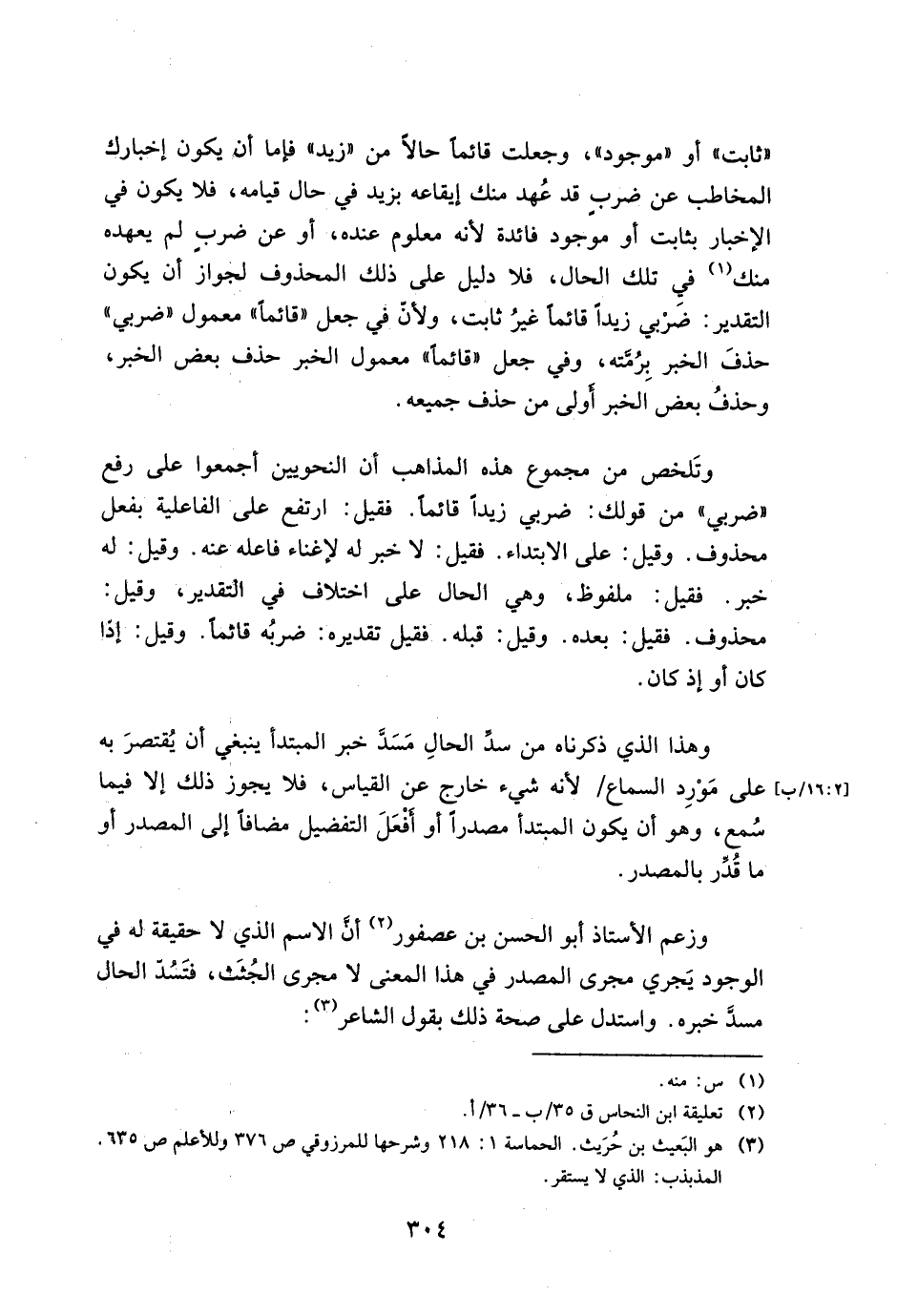 "ثابت" أو "موجود"، وجعلت قائماً حالاً من "زيد" فإما أن يكون إخبارك المخاطب عن ضرب قد عهد منك إيقاعه بزيد في حال قيامه، فلا يكون في الإخبار بثابت أو موجود فائدة لأنه معلوم عنده، أو عن ضرب لم يعهده منك في تلك الحال، فلا دليل على ذلك المحذوف لجواز أن يكون التقدير: ضربي زيداً قائماً غير ثابت، ولأن في جعل "قائماً" معمول "ضربي" حذف الحبر برمته، وفي جعل "قائماً" معمول الخبر حذف بعض الخبر، وحذف بعض الخبر أولى من حذف جميعه.