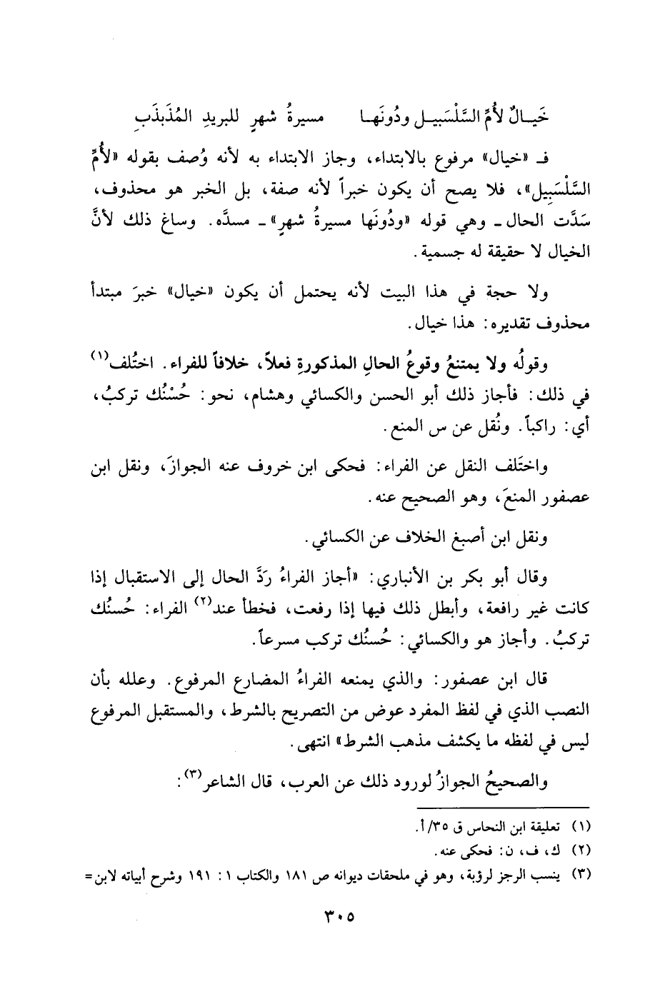 وقوله ولا يمتنع وقوع الحال المذكورة فعلاً، خلافاً للفراء. اختلف في ذلك: فأجاز ذلك أبو الحسن والكسائي وهشام، نحو: حسنك تركب، أي: راكباً. ونقل عن س المنع.