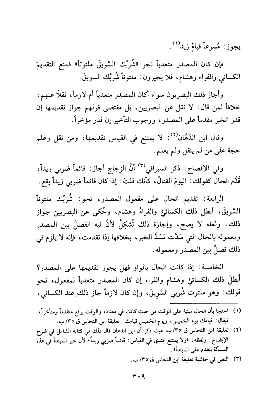 وأجاز ذلك البصريون سواء أكان المصدر متعدياً أم لازماً، نقلاً عنهم، خلافاً لمن قال: لا نقل عن البصريين، بل مقتضي قولهم جواز تقديمها إن قدر الخبر مقدماً على المصدر، ووجوب التأخير إن قدر مؤخراً.