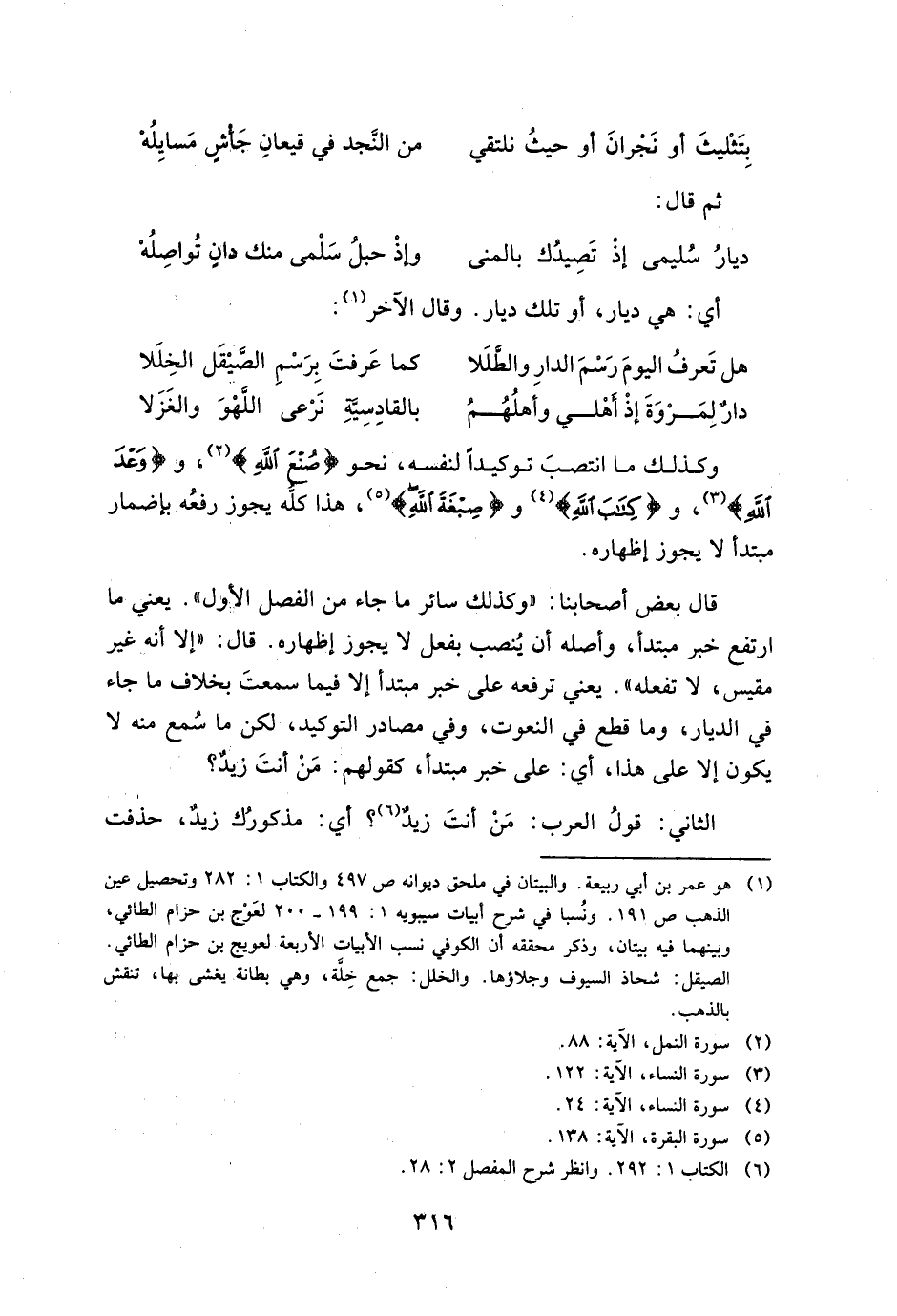 وكذلك ما انتصب توكيداً لنفسه، نحو {صُنْعَ اللَّهِ}، و {وعْدَ اللَّهِ}، و {كَتَبَ اللَّهُ} و {صِبْغَةَ اللَّهِ}، هذا كله يجوز رفعه بإضمار مبتدأ لا يجوز إظهاره.