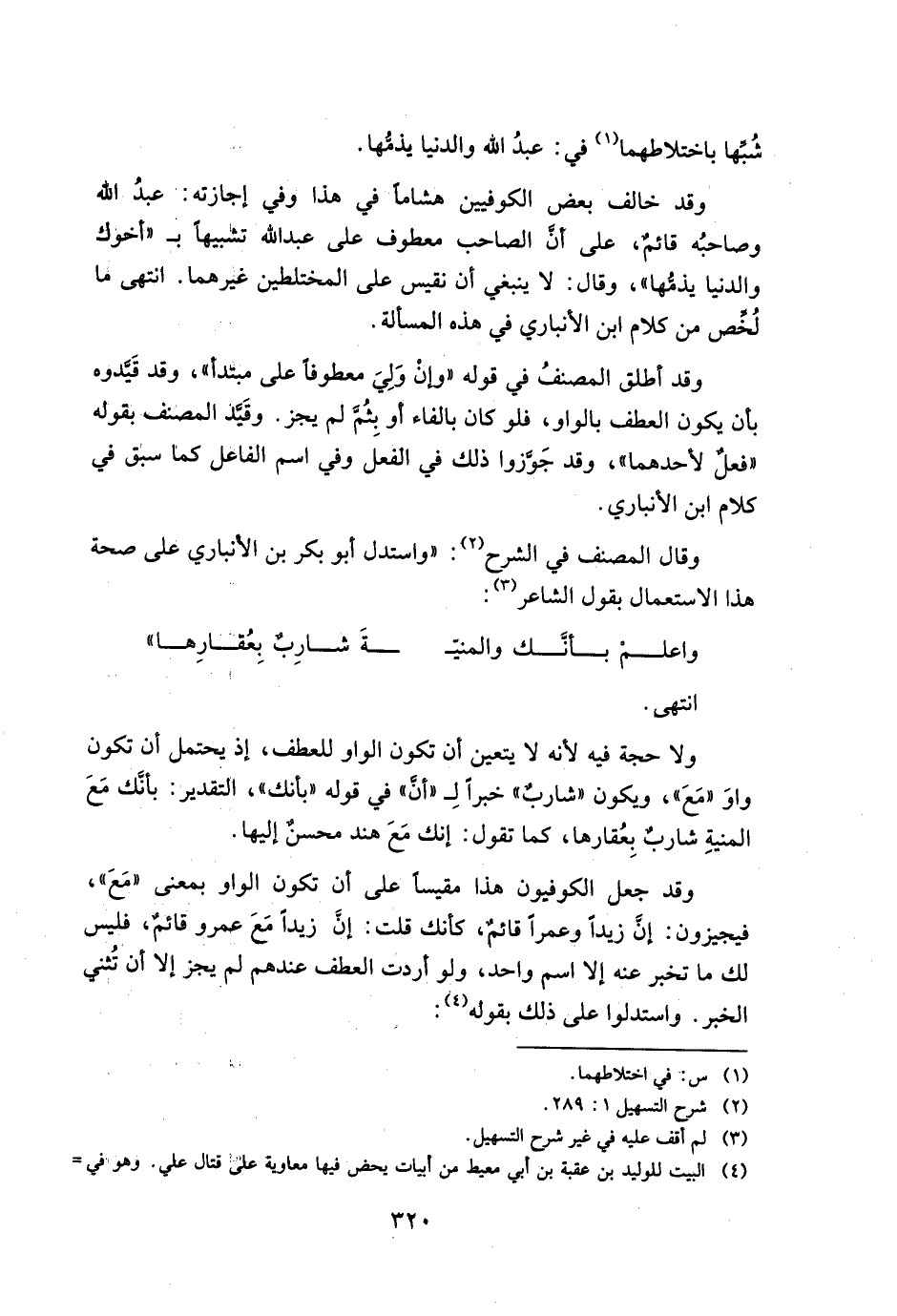 وقد خالف بعض الكوفيين هشاماً في هذا وفي إجازته: عبد الله وصاحبه قائم، على أن الصاحب معطوف على عبد الله تشبيهاً بـ "أخوك والدنيا يذمها"، وقال: لا ينبغي أن نقيس على المختلطين غيرهما. انتهى ما لخص من كلام ابن الأنباري في هذه المسألة.