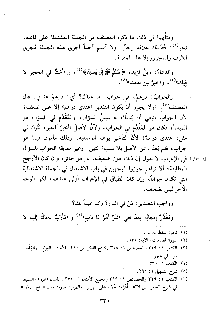والجواب: درهم, في جواب: ما عندك؟ أي: درهم عندي. قال المصنف: "ولا يجوز أن يكون التقدير "عندي درهم" إلا علي ضعف؛ لأن الجواب ينبغي أن يسلك به سبيل السؤال, والمقدم في السؤال هو المبتدأ, فكان هو المقدم في الجواب, ولأن الأصل تأخير الخبر, فترك في مثل: عندي درهم؛ لأن التأخير يوهم الوصيفة, وذلك مأمون فيما هو جواب, فلم يعدل عن الأصل بلا سبب" انتهي. وغير مطابقة الجواب للسؤال في الإعراب لا نقول إن ذلك هو / ضعيف, بل هو جائز, وإن كان الأرجح المطابقة؛ ألا تراهم جوزوا الوجهين في باب الاشتعال في الجملة الاشتغالية التي تكون جوابا, وإن كان الطباق في الإعراب أولي عندهم, لكن الوجه الآخر ليس بضعيف.