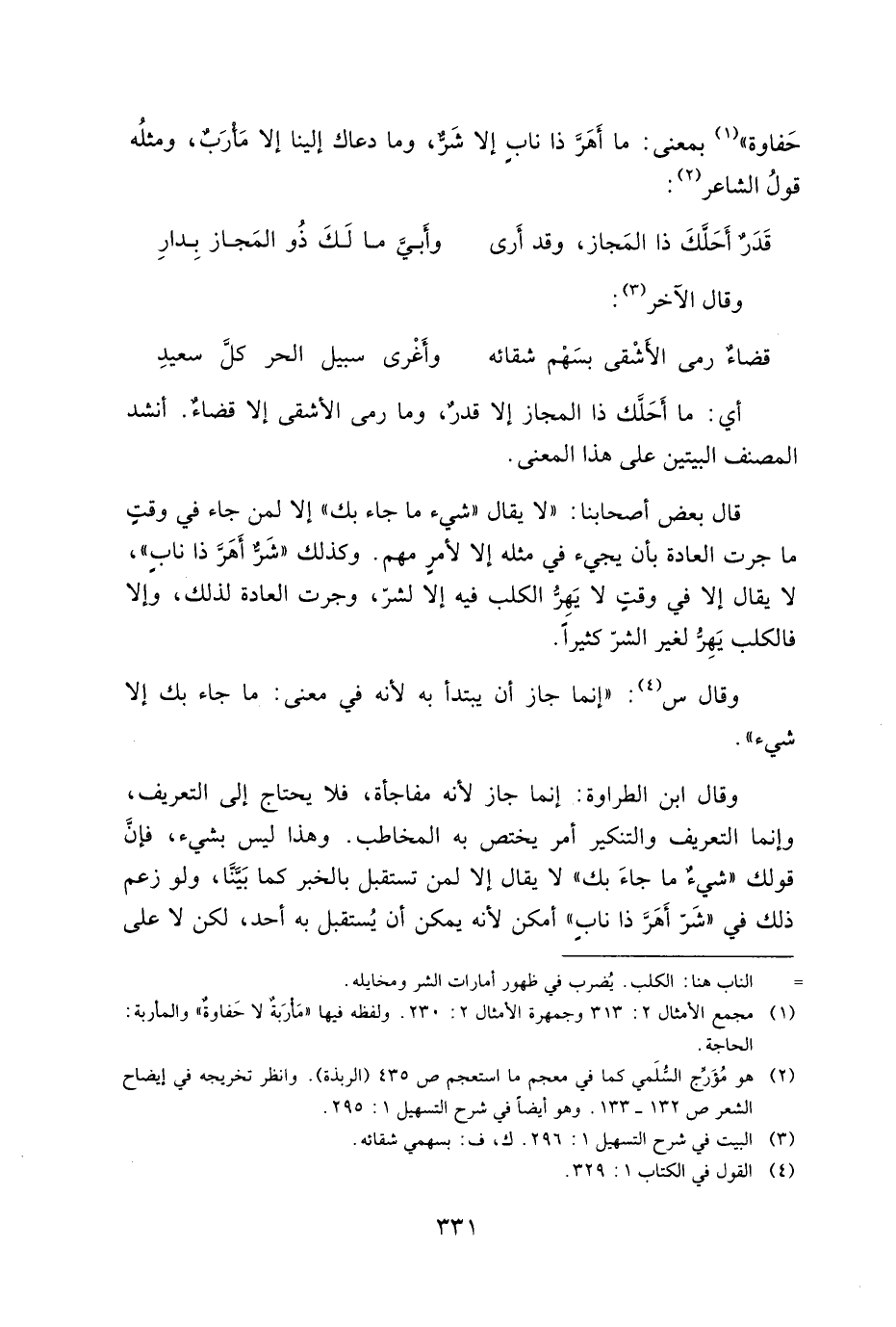 وقال ابن الطراوة: إنما جاز لأنه مفاجأة, فلا يحتاج إلي التعريف, وإنما التعريف والتنكير أمر يختص به المخاطب. وهذا ليس بشيء, فإن قولك "شيء ما جاء بك" لا يقال إلا لمن تستقبل بالخبر كما بينا, ولو زعم ذلك في "شر أهر ذا ناب" أمكن لأنه يمكن أن يستقبل به أحد, لكن لا على